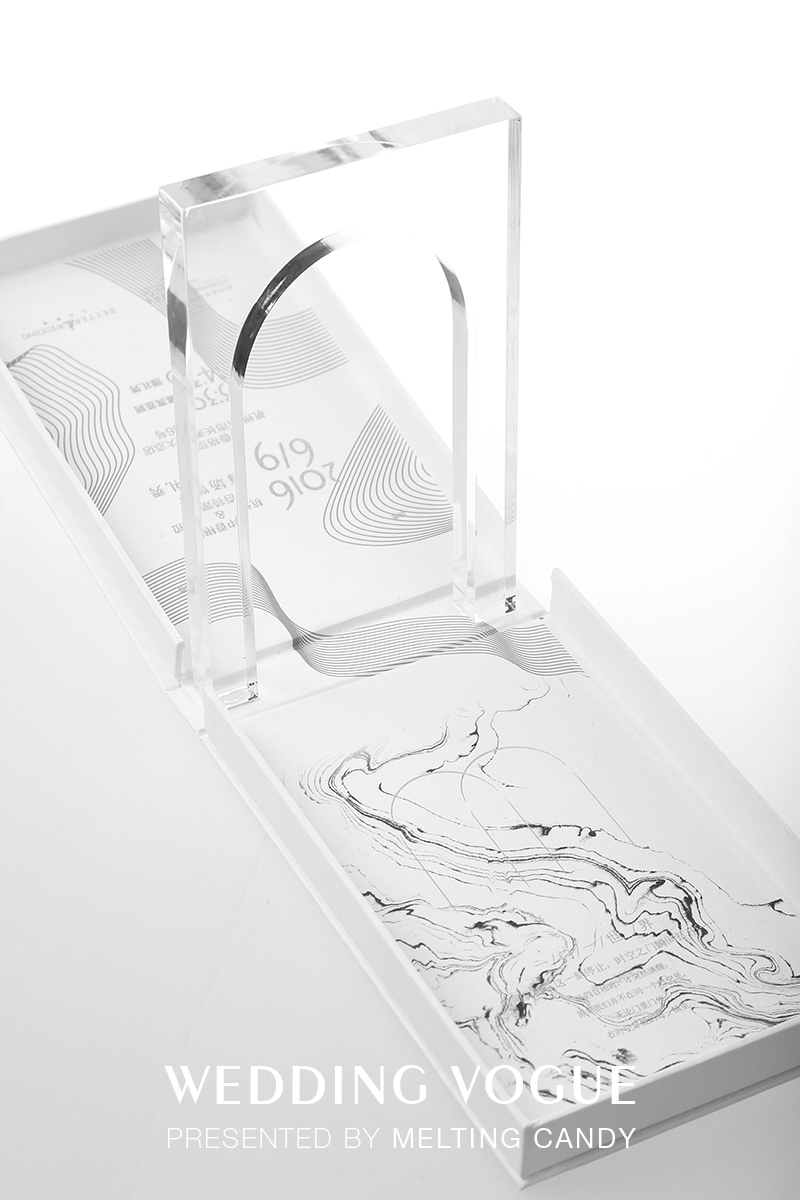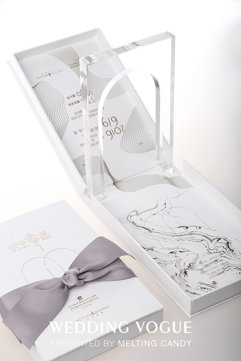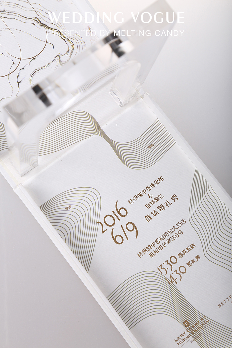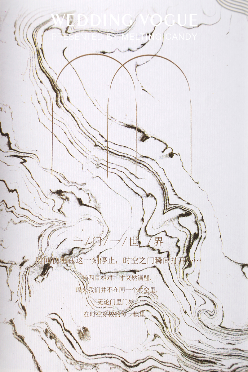 婚礼秀的另一大惊喜,则是由MeltingCandy很有爱婚品设计定制的邀请函。主元素门作为一个空间的载体,展现了这边与那边。一边是中式的水墨肌理,一边是简洁现代的条纹。不同质感 亦或是文化理念,通过简洁的黑白融合在一起,通过一个透明的门贯穿其中。区别于传统平面,立体的邀请函将时空的概念表达的淋漓尽致,趣味盎然。
