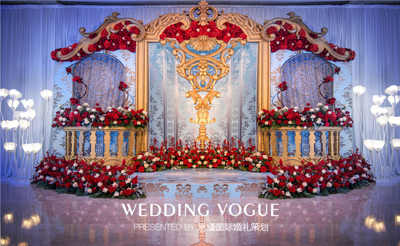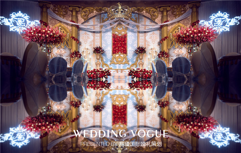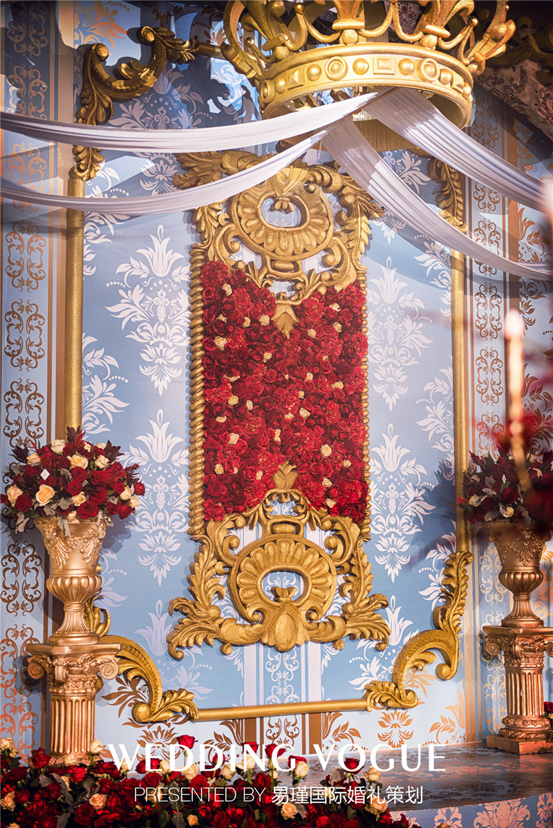婚礼布置以立体造型为主,主舞台烘托的是皇室宫殿的气氛,舞台四周是金色的皇室立柱,雕刻花纹以及金色吊灯,搭配玛莎拉红的鲜花。金色华丽高贵,又如同阳光一般,照亮了彼此的世界;静谧蓝如男人的包容和胸怀,那么的坚定,沉静而美好;玛莎拉红色,它高贵内敛,醇厚丰富,代表温暖与幸福。舞台正中间的背景设计是王座的设计,搭配鲜花,代表着新郎与新娘。悬浮的金色皇冠,延伸出的四条流线型布幔,使现场感觉看起来更加柔和优雅,皇冠 既有加冕的寓意,又是新郎许新娘一个未来的庄重承诺。