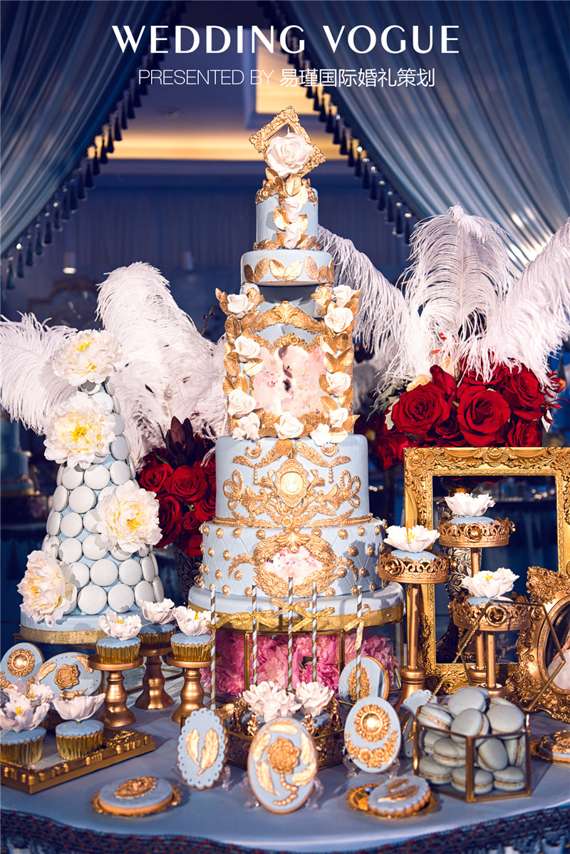 在整个婚礼的色彩搭配上,没有选择传统的中国红,而是大胆的选用了静谧蓝,搭配金色和玛莎拉红。作为婚礼的颜色选择,这种颜色搭配自伊始受到质疑,但事实证明,耳目一新的颜色搭配更能带来不一般的效果,也更让人印象深刻。