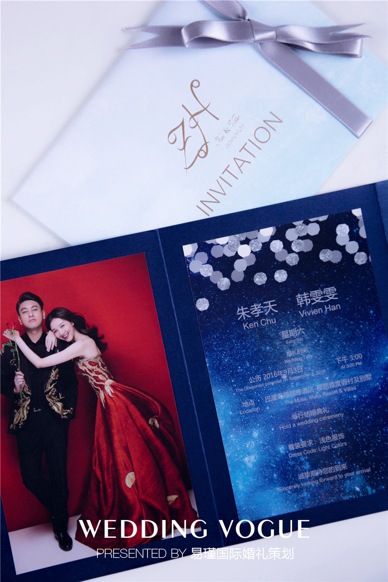 朱孝天和韩雯雯婚礼喜帖也是由易瑾国际婚礼策划设计的。星空主题唯美浪漫,摩登前卫,象征着他们的爱情像星辰一般永恒,意味着他们对待婚姻的辽阔心胸和彼此间的守护和包容,更是易瑾国际婚礼策划对夫妇二人最诚意的祝福!