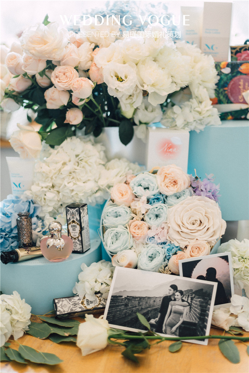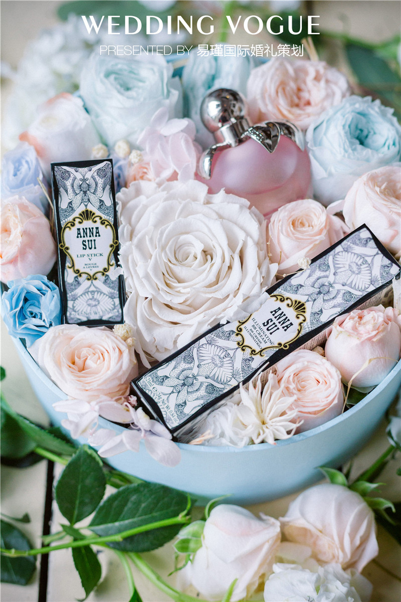 易瑾国际婚礼策划结合了这些礼品的特点与婚礼主题,定制了粉蓝色圆形礼盒,辅以鲜花与新人的照片,搭配银色缎带,显得格外优雅大方。易瑾国际婚礼策划也希望通过全手工制作的伴手礼,让所有宾客感受到新人的喜悦与美好。