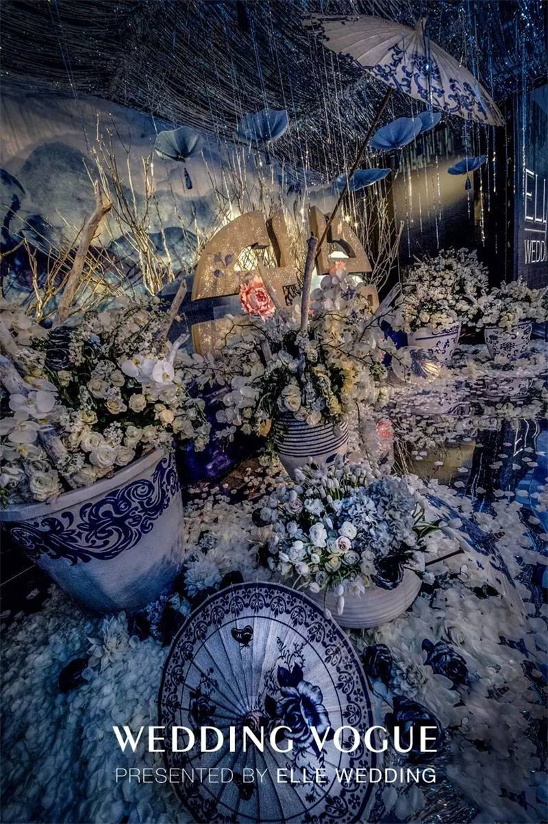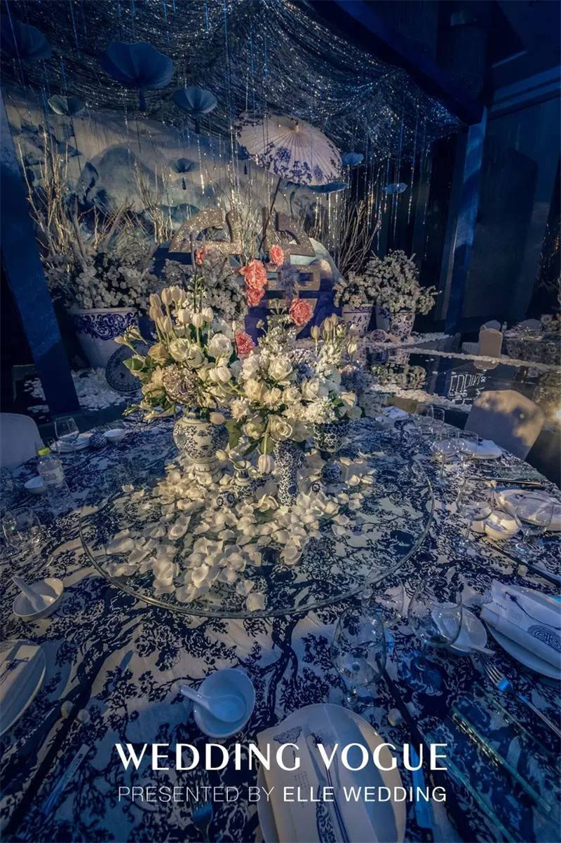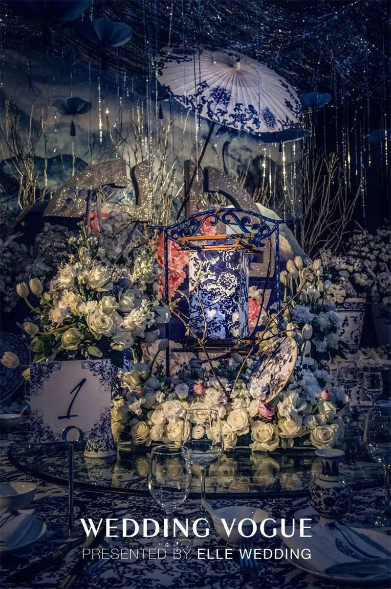 一场以青花瓷为主题的婚礼布置,全场运用了线描勾勒表达主题。