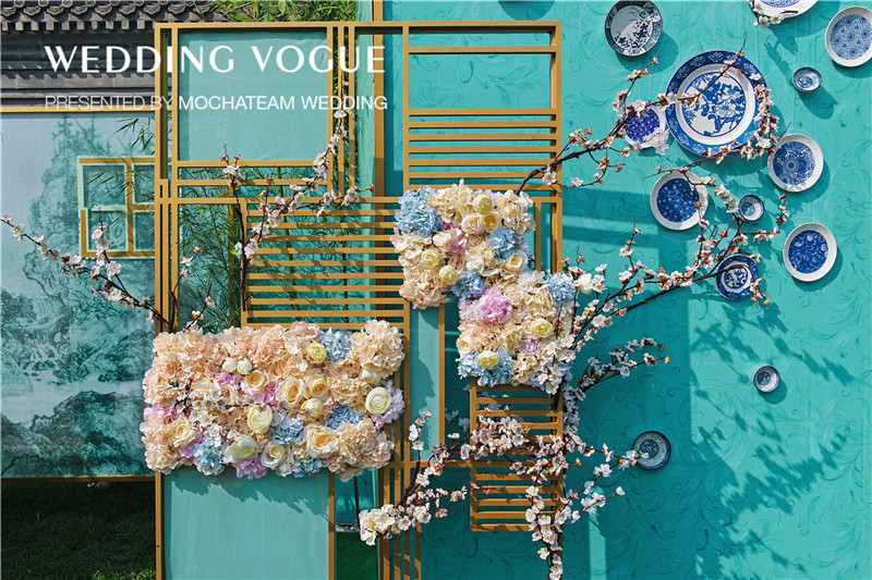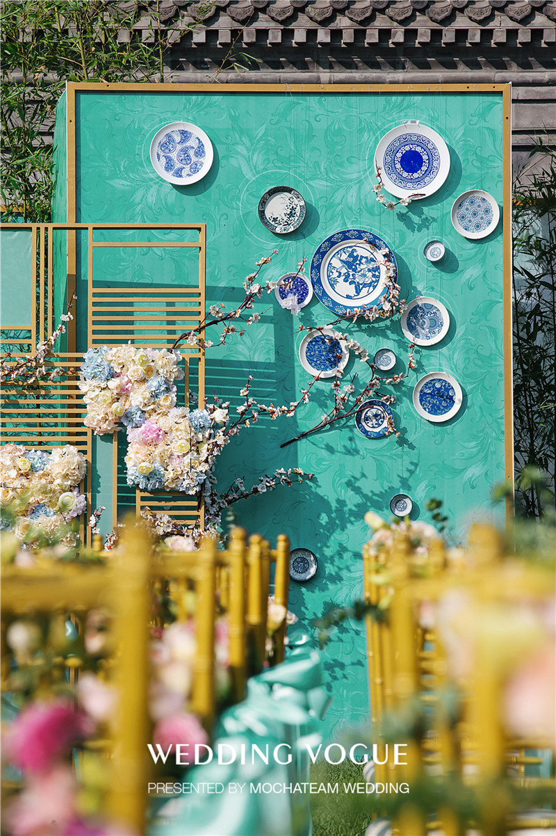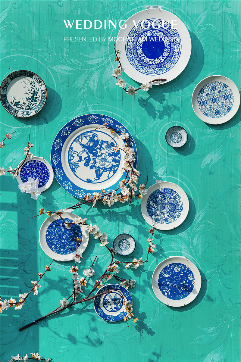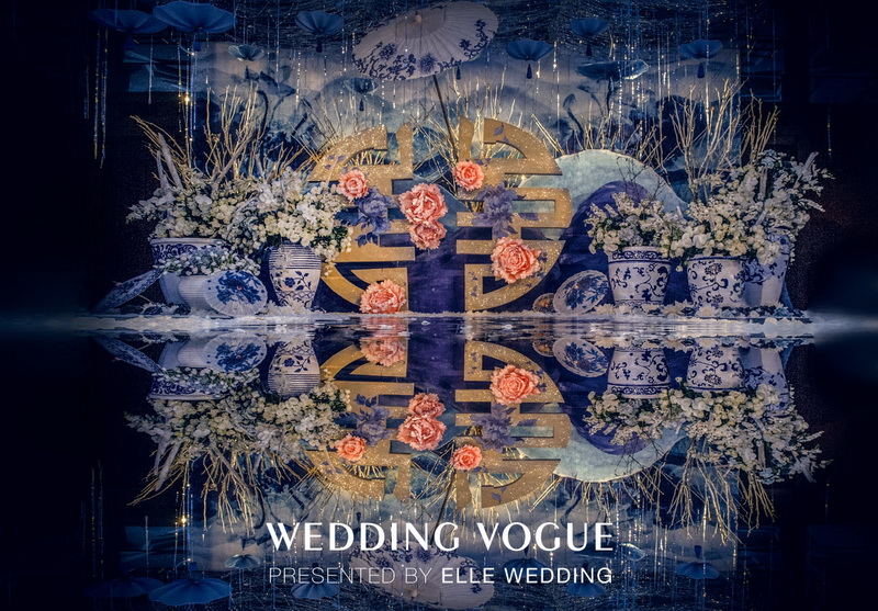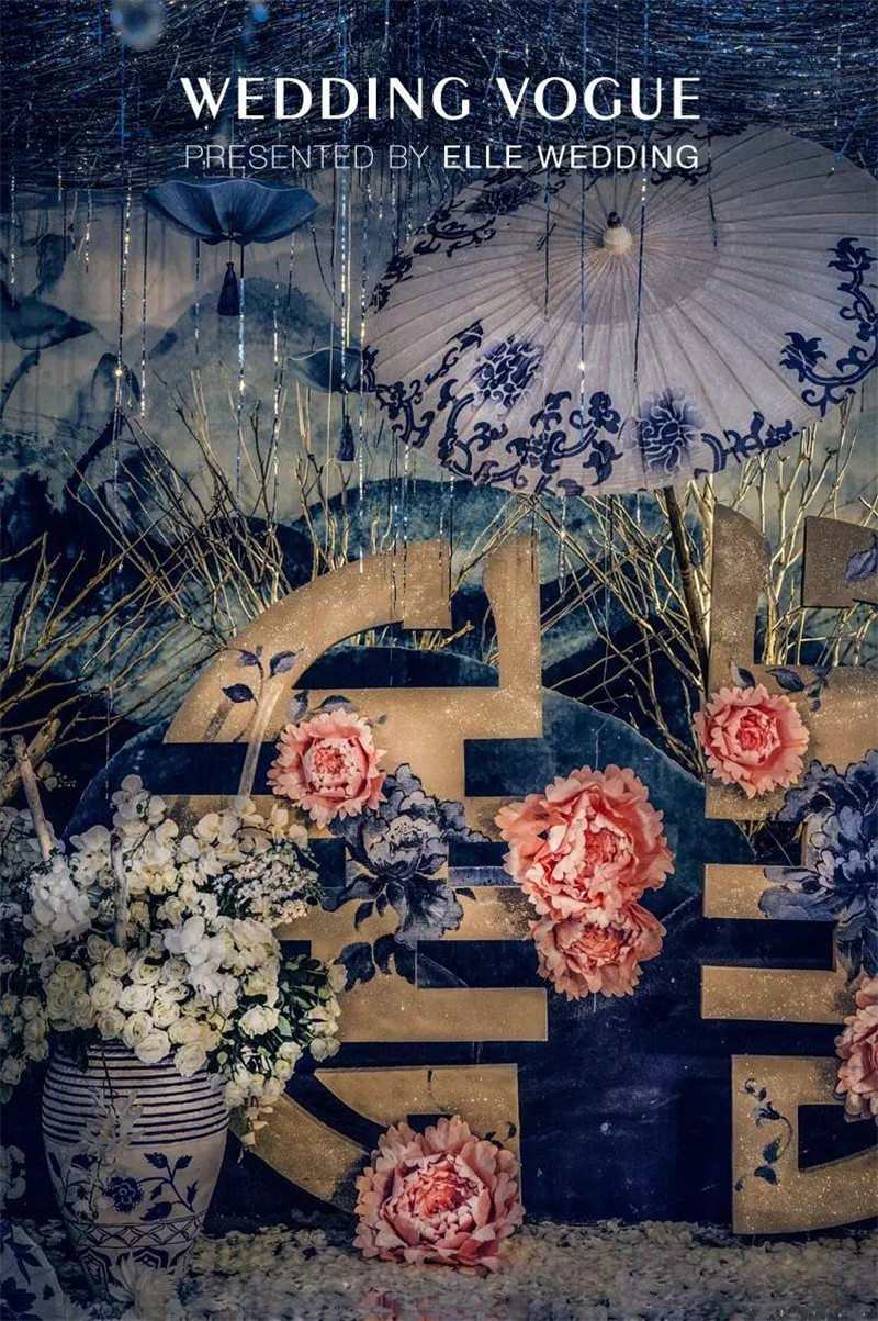 一场以青花瓷为主题的婚礼布置,全场运用了线描勾勒表达主题。