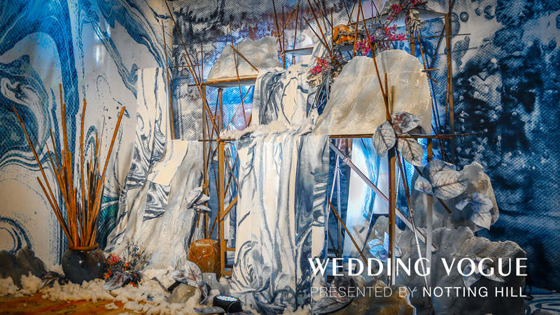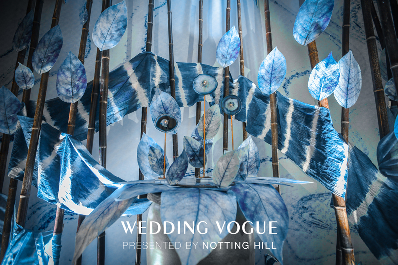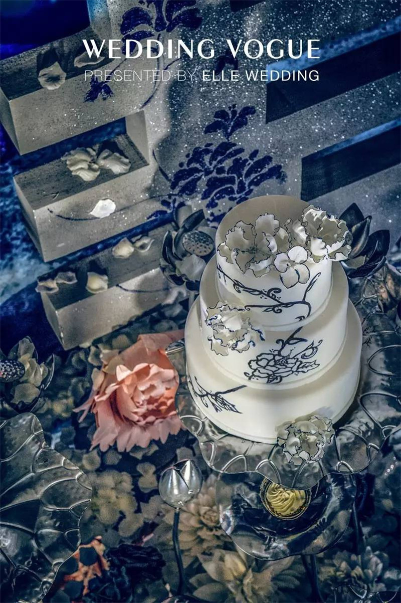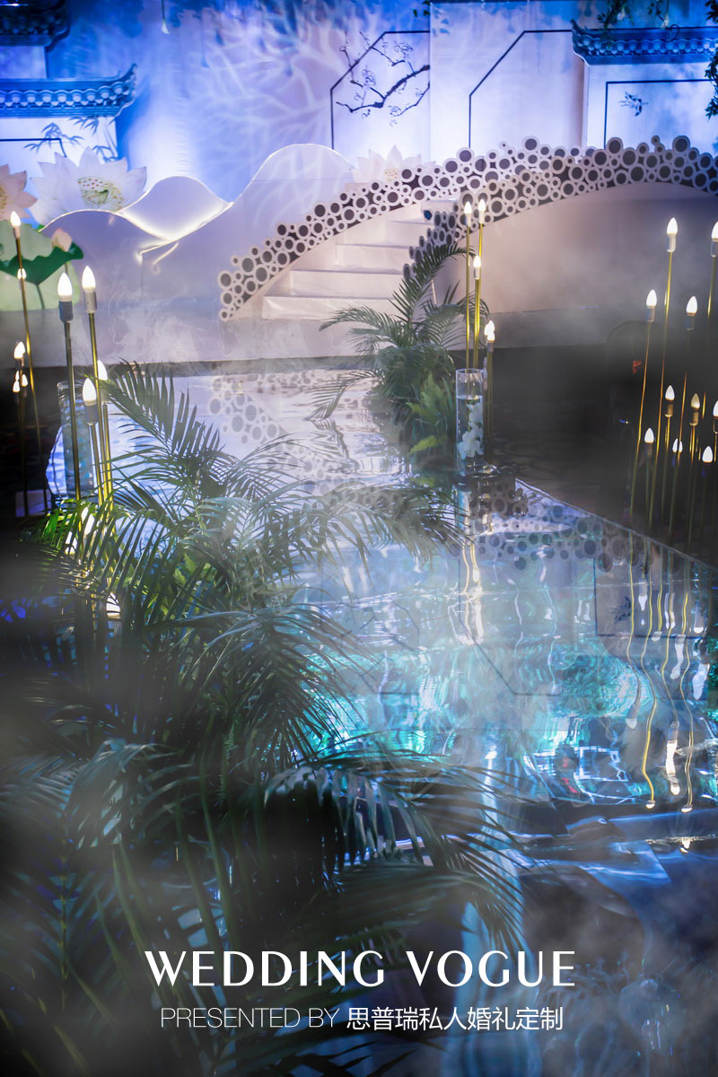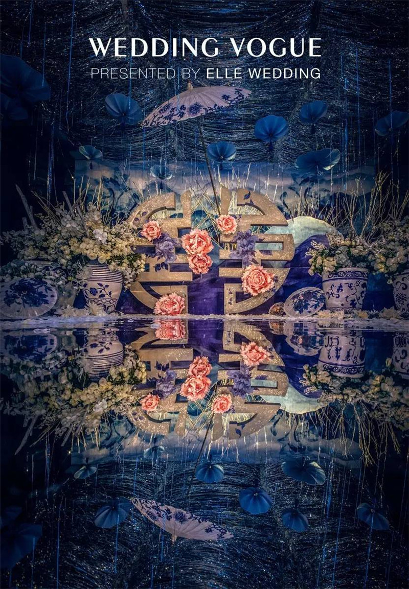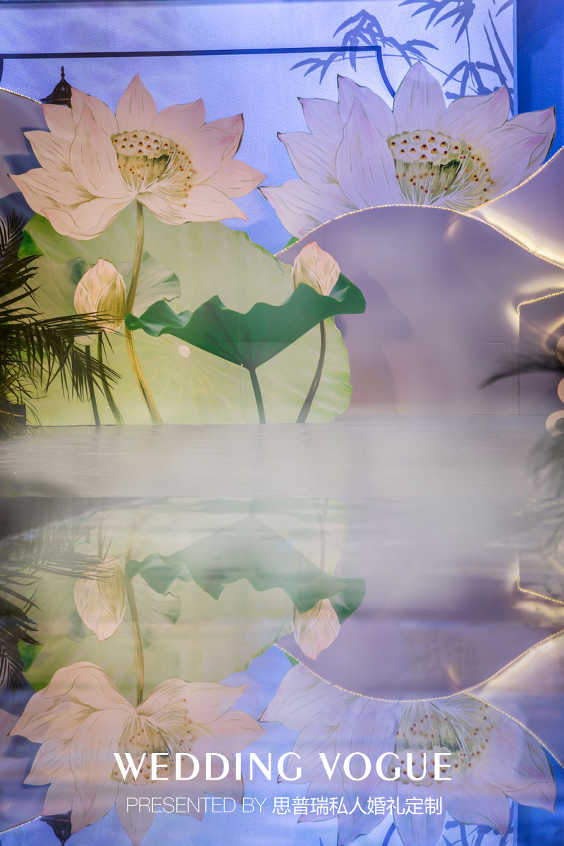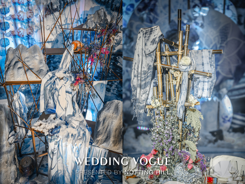 国画里有一种墨染手法,就是在上墨时浸透水后一层层晕开,最后以墨晕出画面,后用于染布。这场婚礼整场以蓝色为基调如同蓝墨被层层跌宕晕开,从仪式区的水墨莲花到场内的布置,令人仿佛走入了一场水墨画中,唯美诗意。