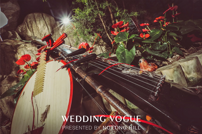 室内呈现的字画、古琴、唐代仕女图等物品展示仿佛这不是一场婚礼,而是一场文人雅士间的聚会。字画散发墨香,仿佛嘈杂的室内都平静了下来,进入了一个悠然自得的世界。