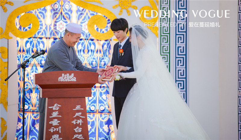 请本坊教长或阿訇来主持婚礼,并为新人念祝贺经文,俗称“尼卡哈”。阿訇先问新郎、新娘名字,再问新郎是否愿意娶她,新娘是否愿意嫁他,双方作了肯定回答后,阿訇诵读《古兰经》选段,祈祷和祝愿美满幸福,教导严守教规,孝敬父母,求学上进,互敬互爱,白头偕老。之后,阿訇将男方家准备好的核桃、枣子、花生、水果糖等,亲自抛撒给前来贺喜的人,以示夫妻和睦,早生贵子。