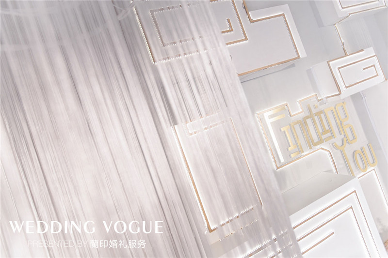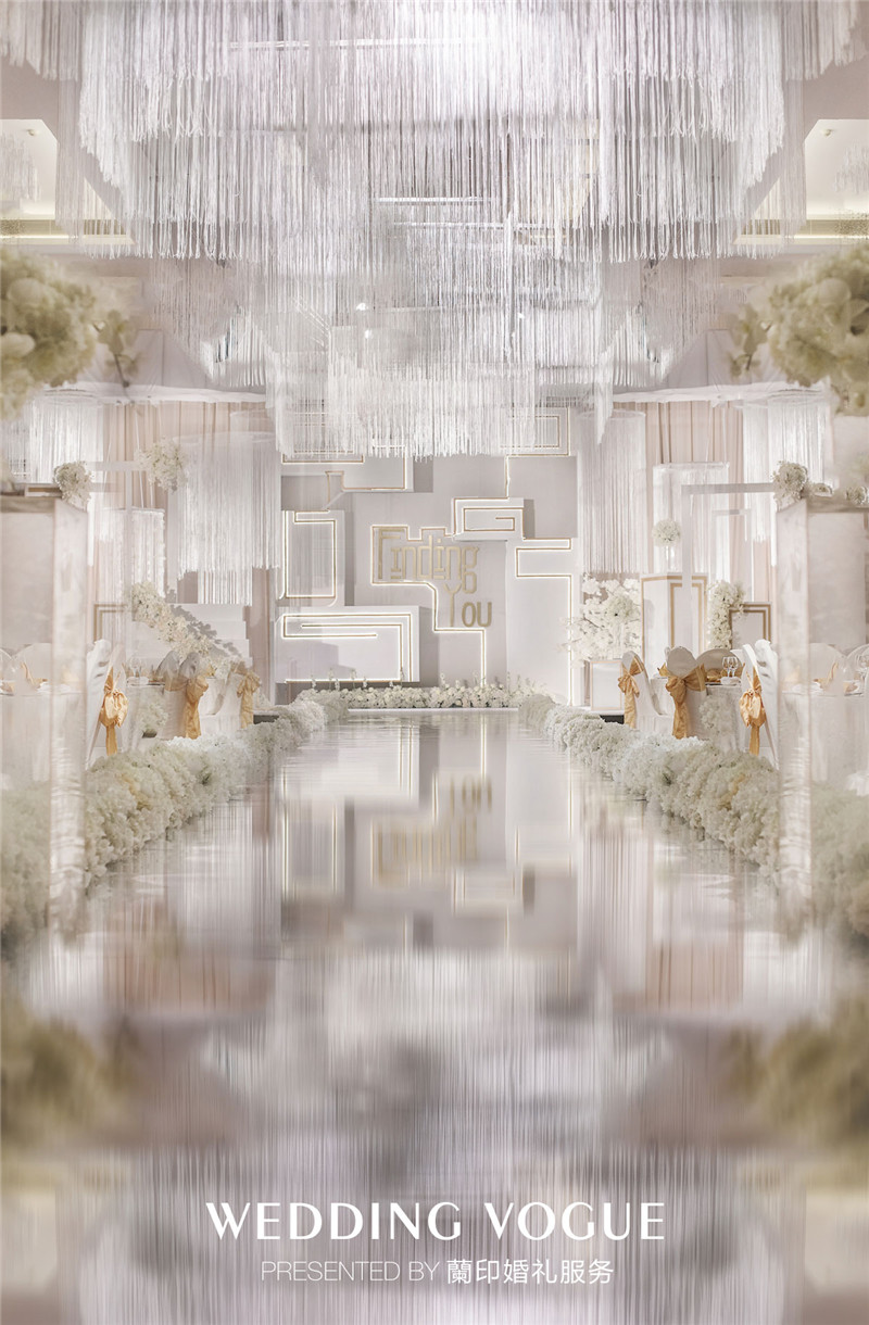 在主舞台部分,蘭印婚礼服务采用具象的迷宫线条去体现“迷”。凹凸错落的方块,以金色的简单线条勾勒,佐以T台上方的定制道具,从平面和纵深两位维度来体现了寻找的感觉。而材质选择了镜面和透明质感,配合布置的明暗处理和宴会灯光,整个色调纯净而通透。