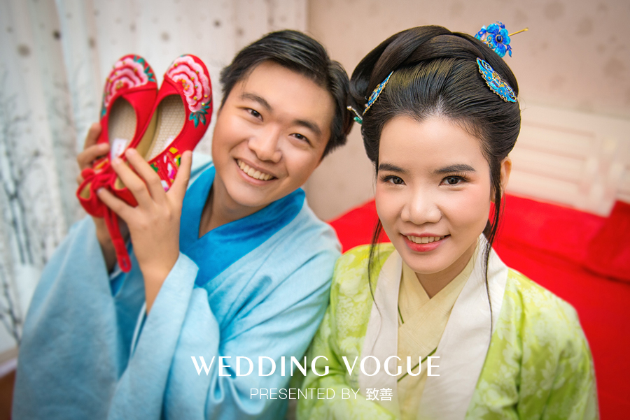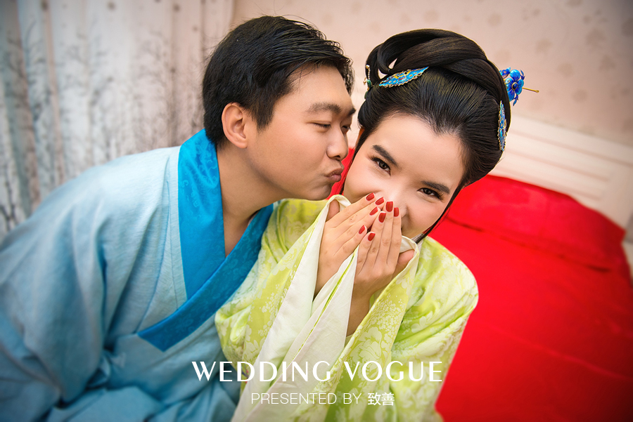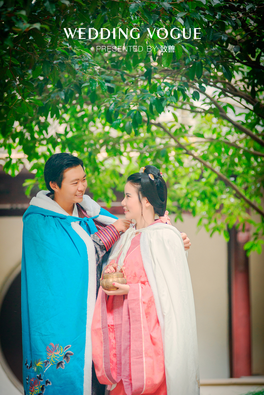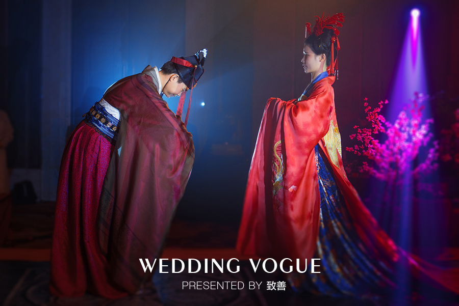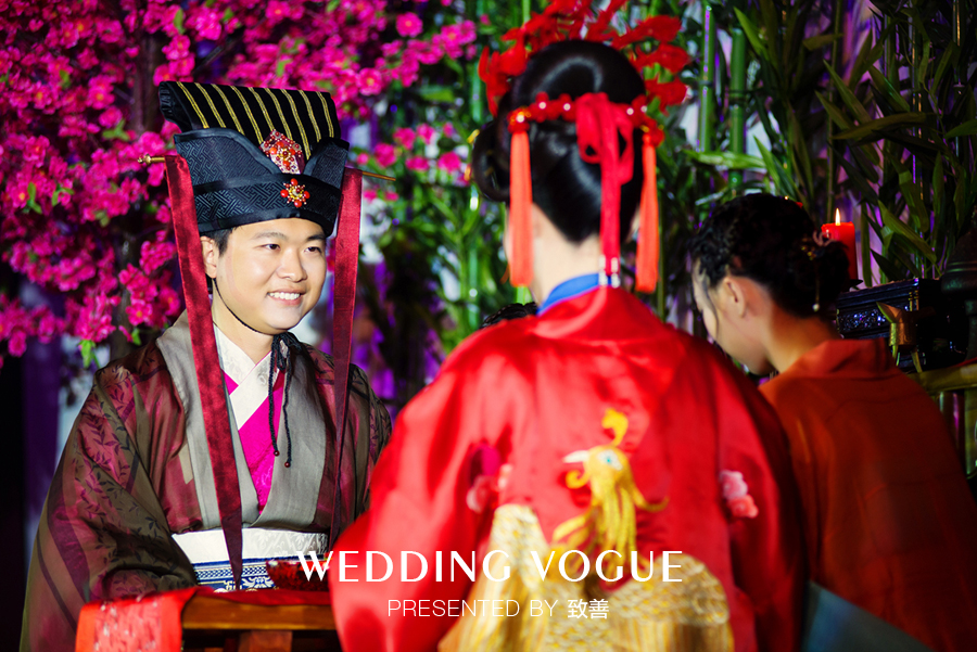 唐风最是倾国,唐朝婚礼服饰融合了先前的庄重神圣和后世的热烈喜庆;唐制是男服绯红,女服青绿,所谓“红男绿女”是也。