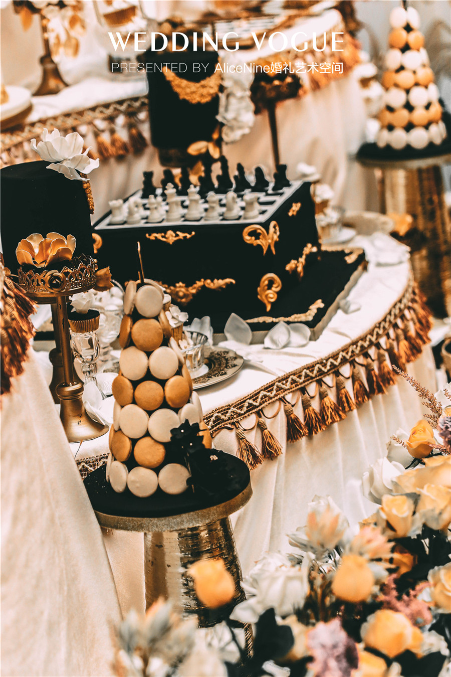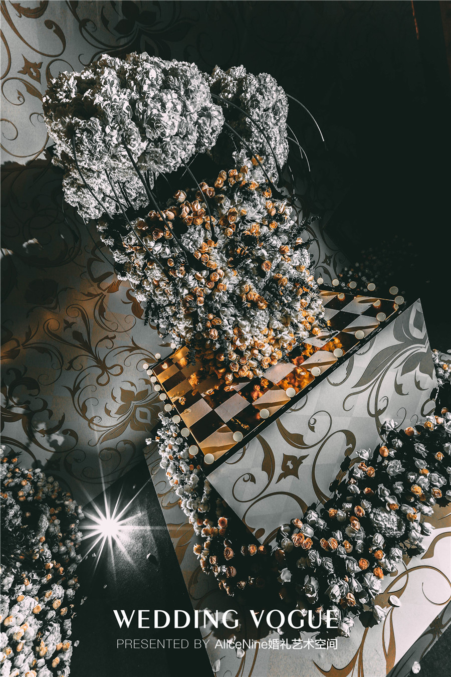 婚礼主题名为《零和博弈》,灵感源于国际象棋的规则,棋盘上黑白双方你来我往,但皇后永远至高无上,就如同新人双方感情模式——个性鲜明独立,棋逢对手,势均力敌。本场婚礼设计中最为特别的是异形舞台的设计和迎宾区全封闭式空间的设计增强宫廷宴会氛围,打造身临其境之感。
