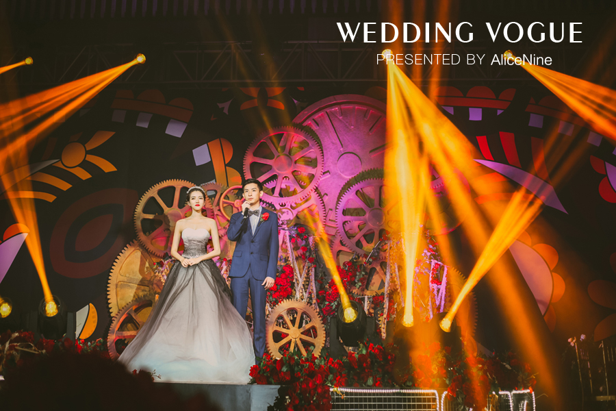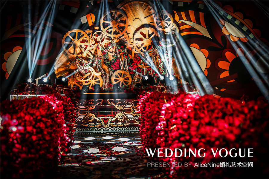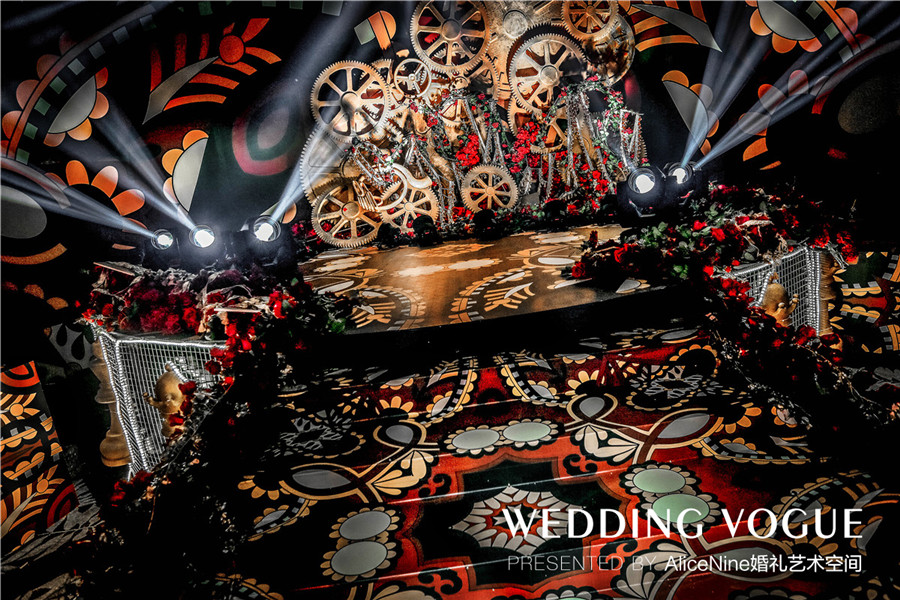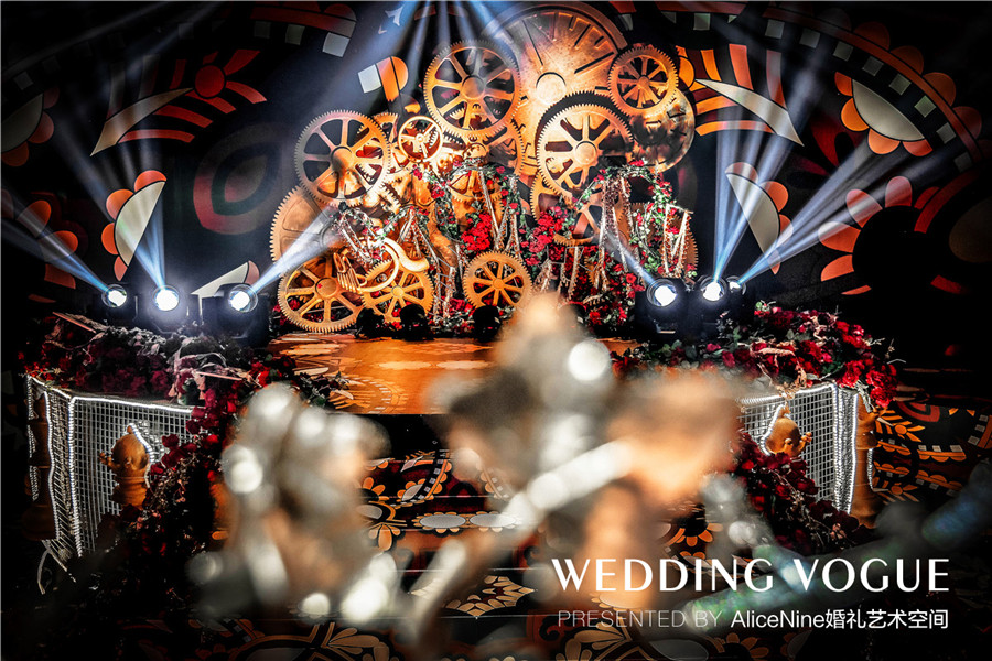 舞台分为三个部分,仪式主舞台、乐队表演舞台及专门为升降香槟塔而制作的舞台。三个舞台高低不同,打破传统的平面性感觉增加了舞台空间层次感。主背景是一个复古时光机,由齿轮及时钟构成,整个舞台没有做太多错综复杂的悬挂,给来宾保留干净清晰的视觉效果。