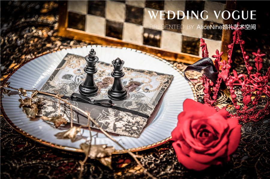 当我们步入宴会厅时,婚礼布置将我们带入了棋盘中。宴会厅T台分为两个部分,前三分之二段由西洋棋棋子Rook的顶部构成,实际效果如同鲜花蔓延的围墙,新人走在由红色玫瑰与海芋百合铺满的T台进入舞台。接下来是一个金与黑组成的西洋棋棋盘,通过棋盘走上圆形的主舞台象征最后的共赢。