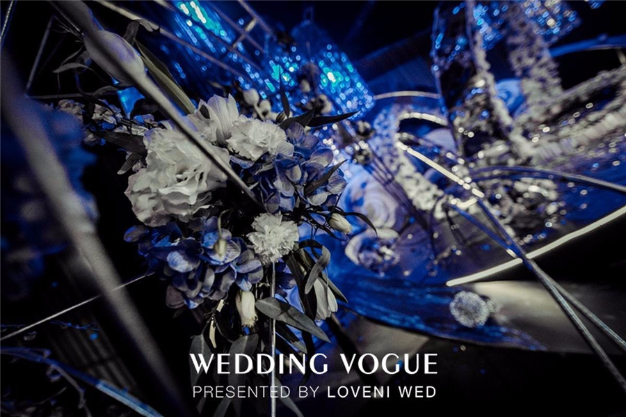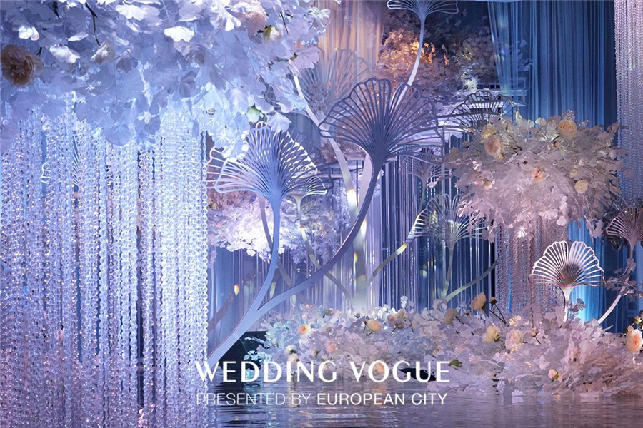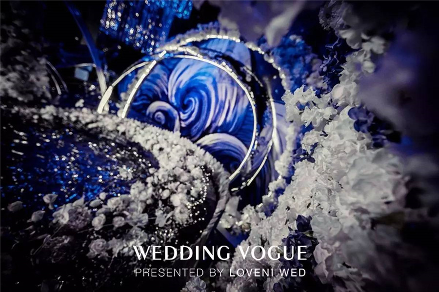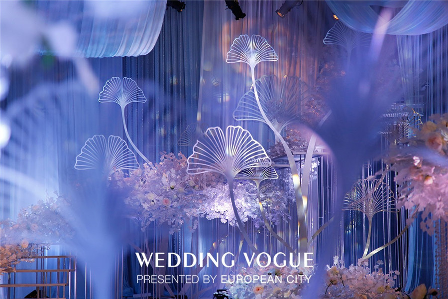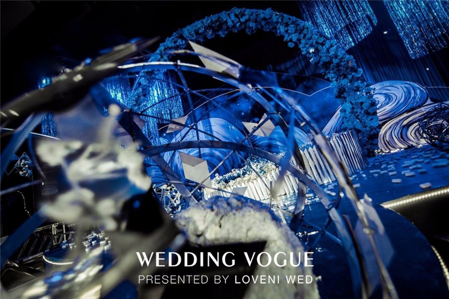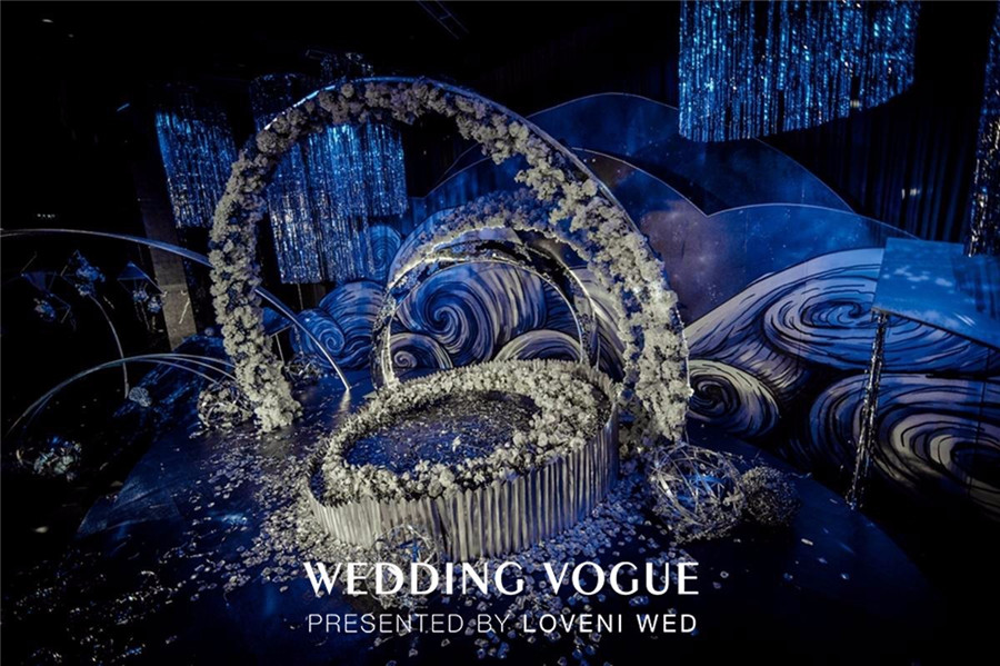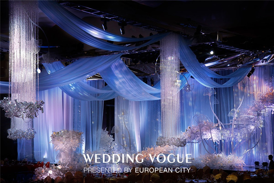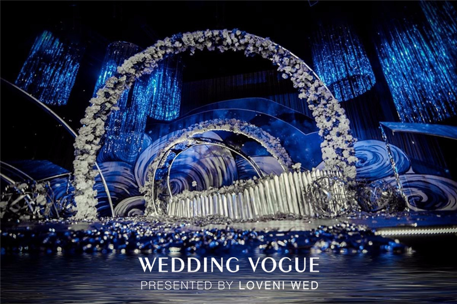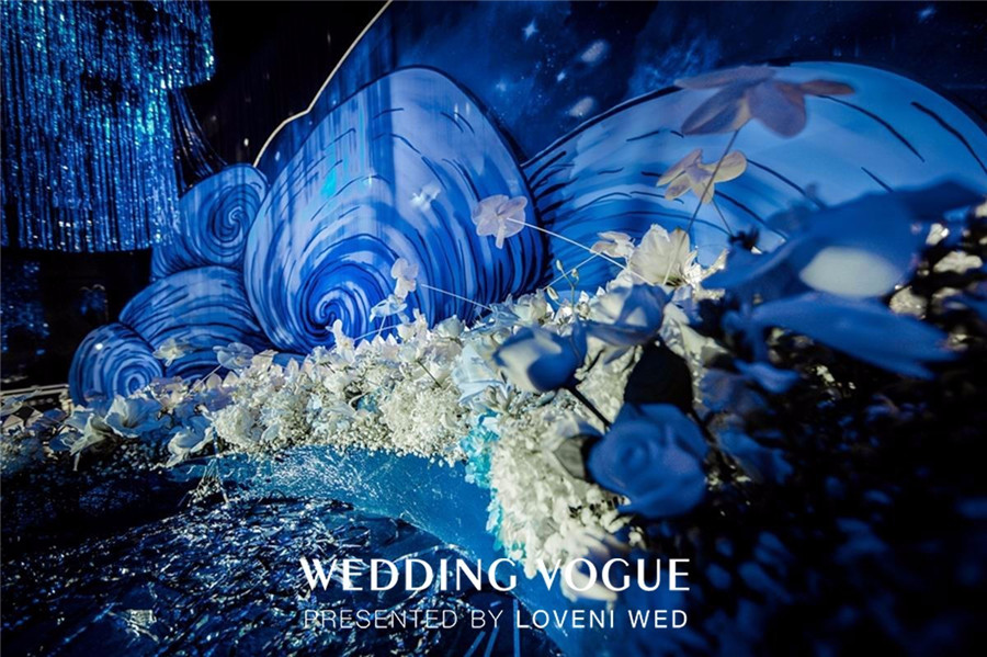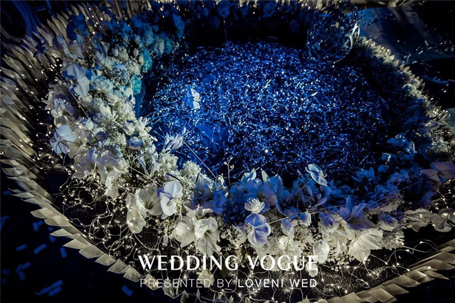 教堂前端是蓝白渐变的花瓣,尽头是云层般的鲜花围绕着星云轨迹的主背景。从踌躇到确定,从深邃到明亮,我们似乎可以从中读懂在浩瀚星空里两人宿命的结合,震撼又温暖。
