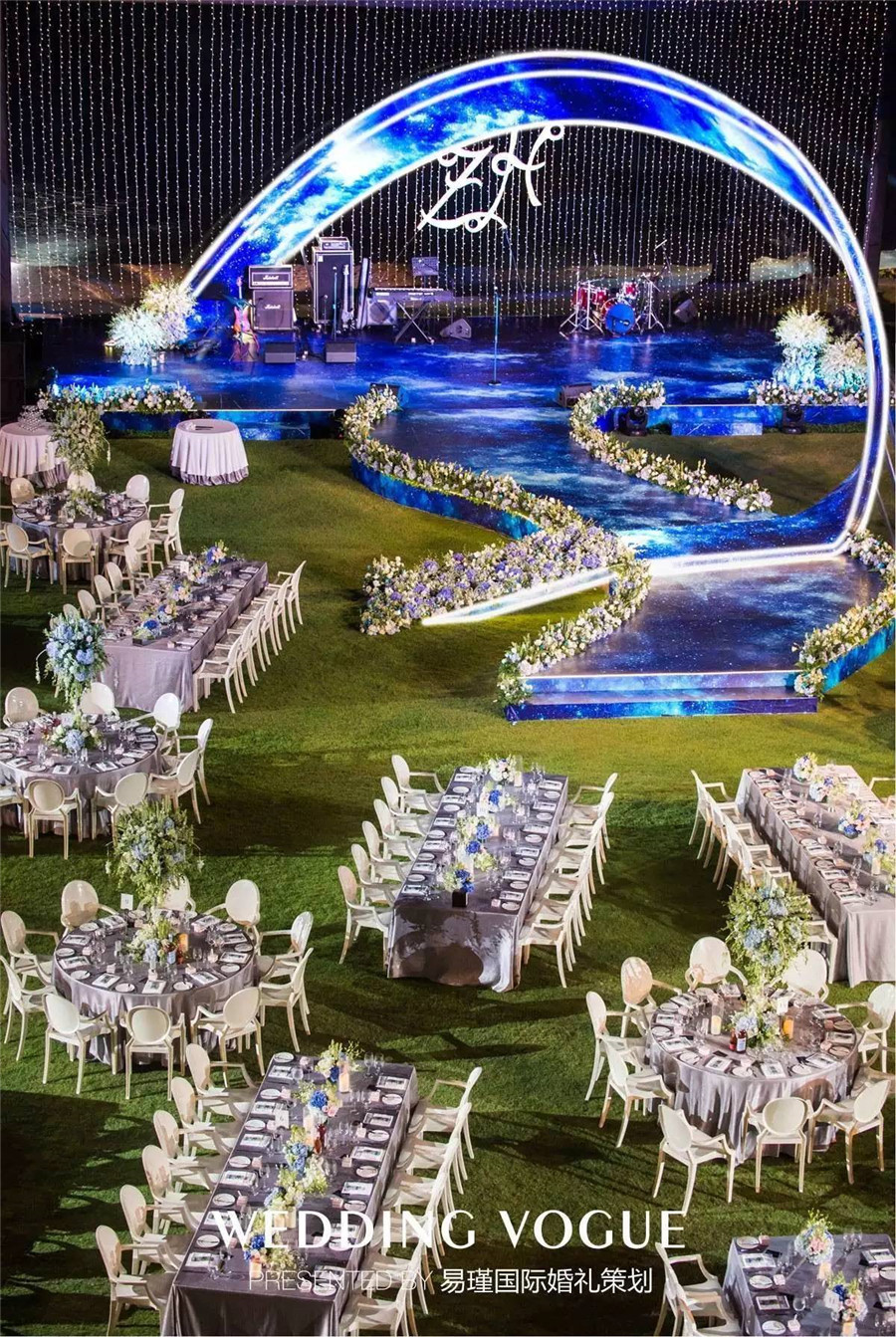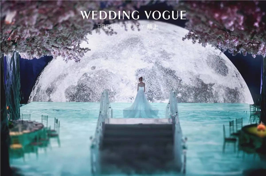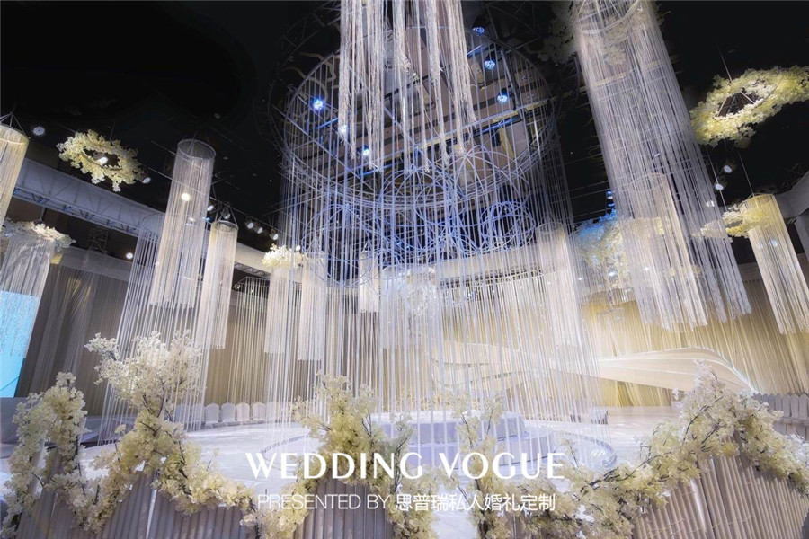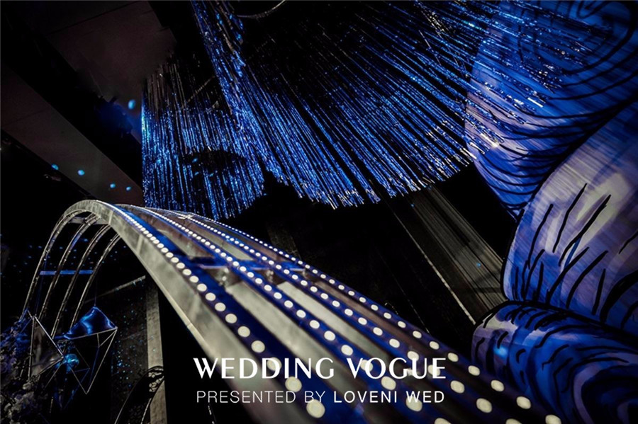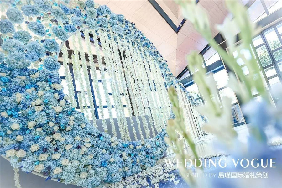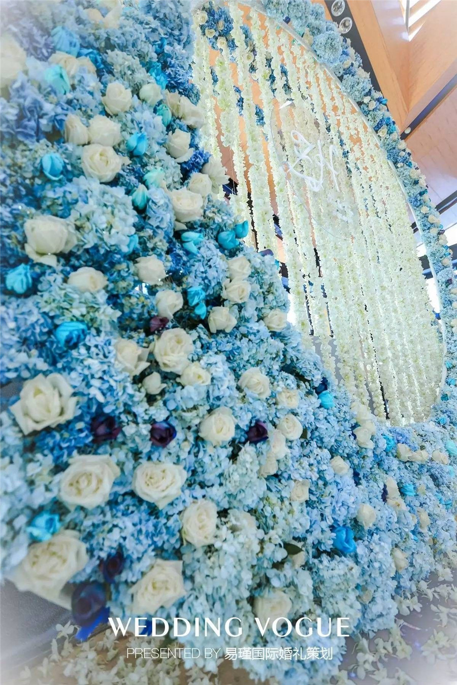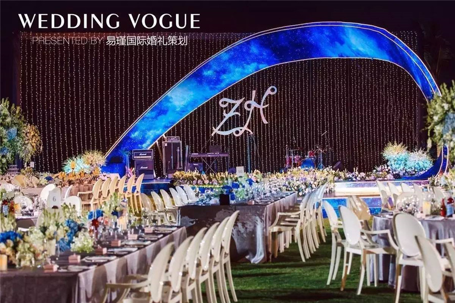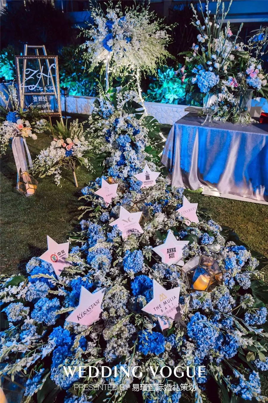 教堂前端是蓝白渐变的花瓣,尽头是云层般的鲜花围绕着星云轨迹的主背景。从踌躇到确定,从深邃到明亮,我们似乎可以从中读懂在浩瀚星空里两人宿命的结合,震撼又温暖。