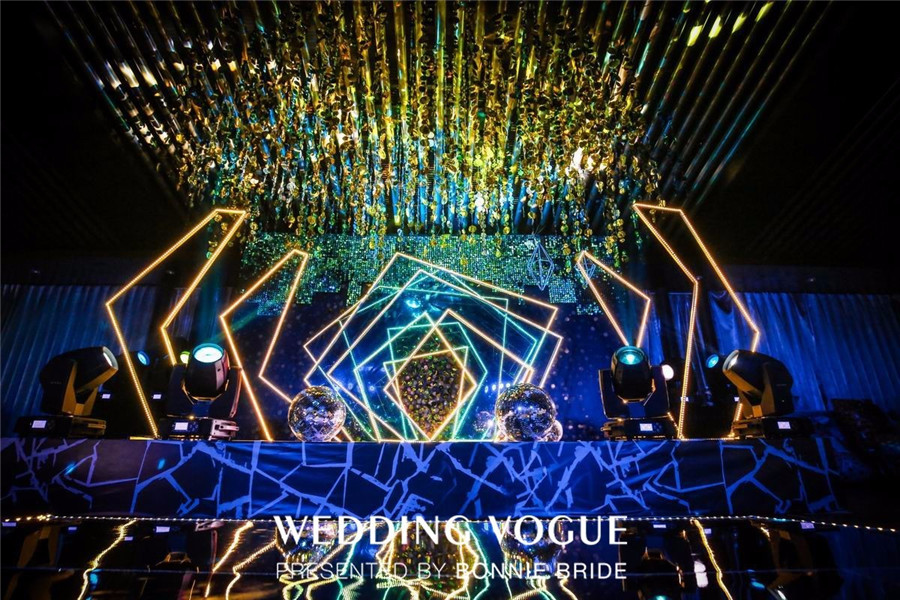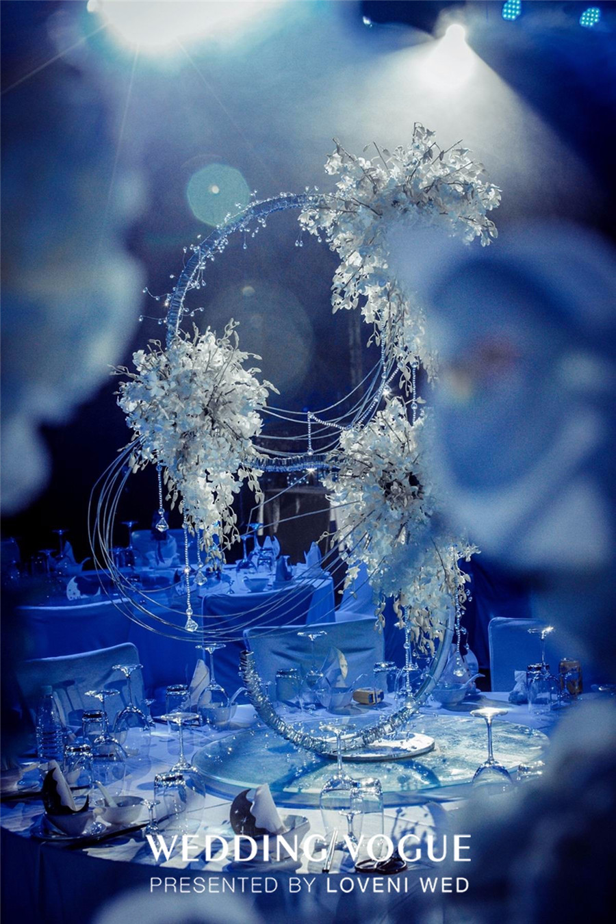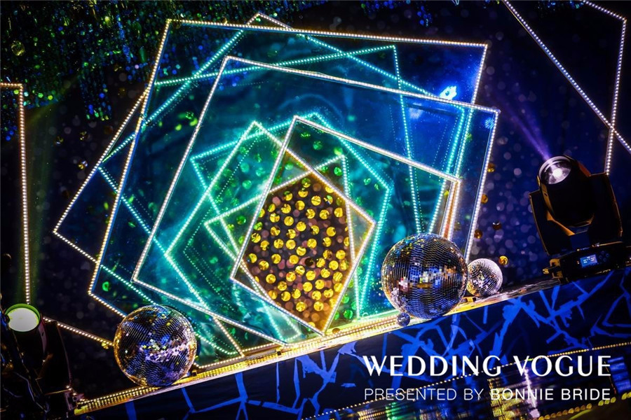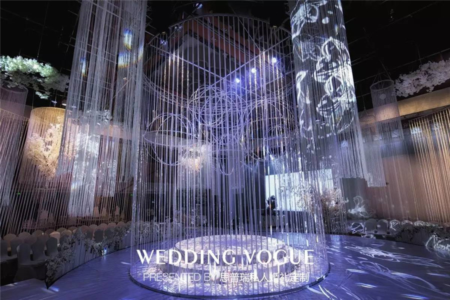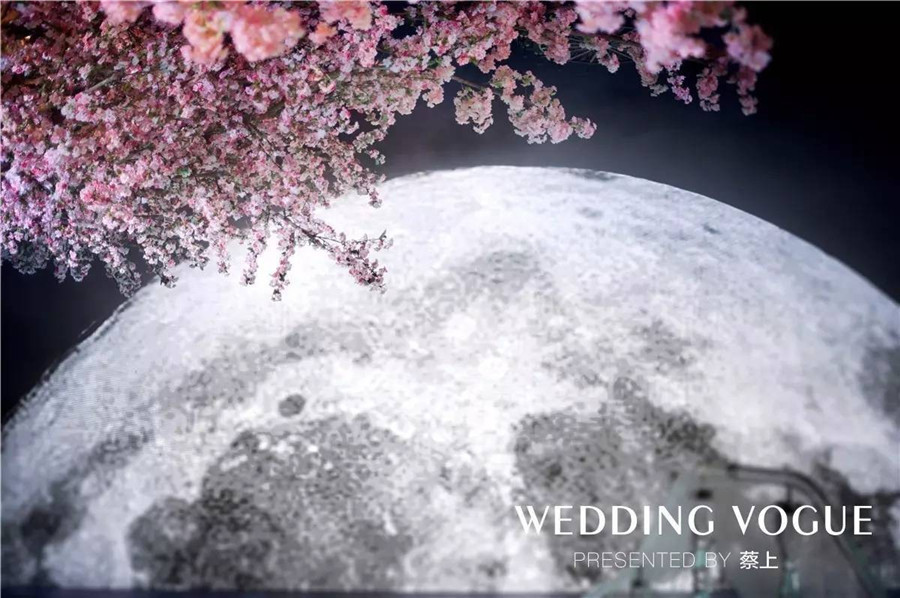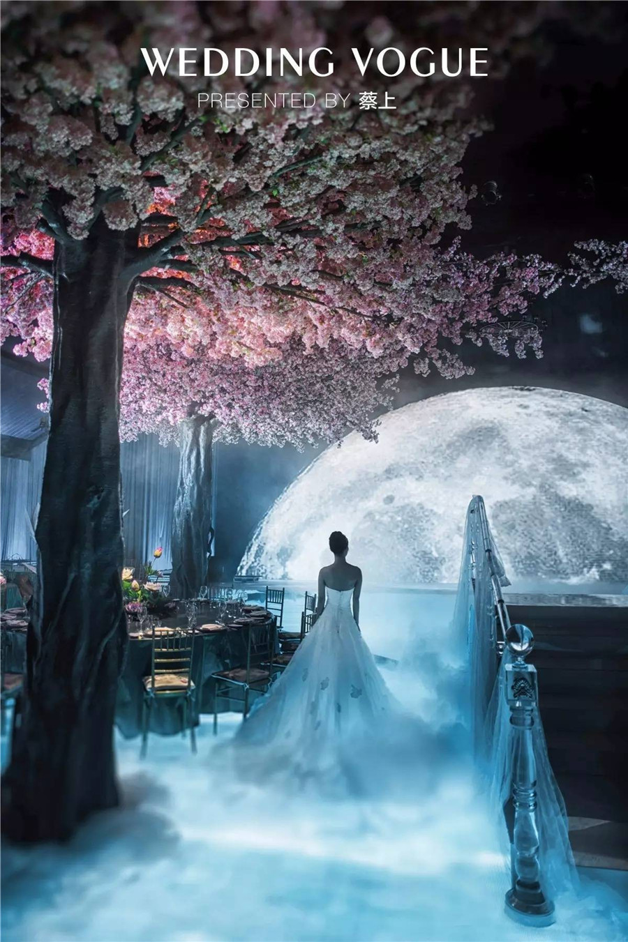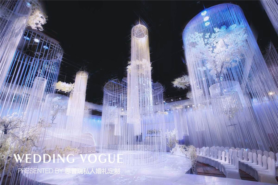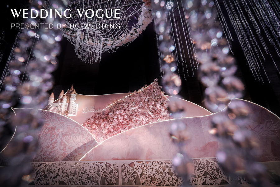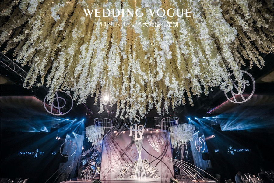 教堂前端是蓝白渐变的花瓣,尽头是云层般的鲜花围绕着星云轨迹的主背景。从踌躇到确定,从深邃到明亮,我们似乎可以从中读懂在浩瀚星空里两人宿命的结合,震撼又温暖。