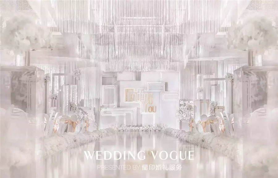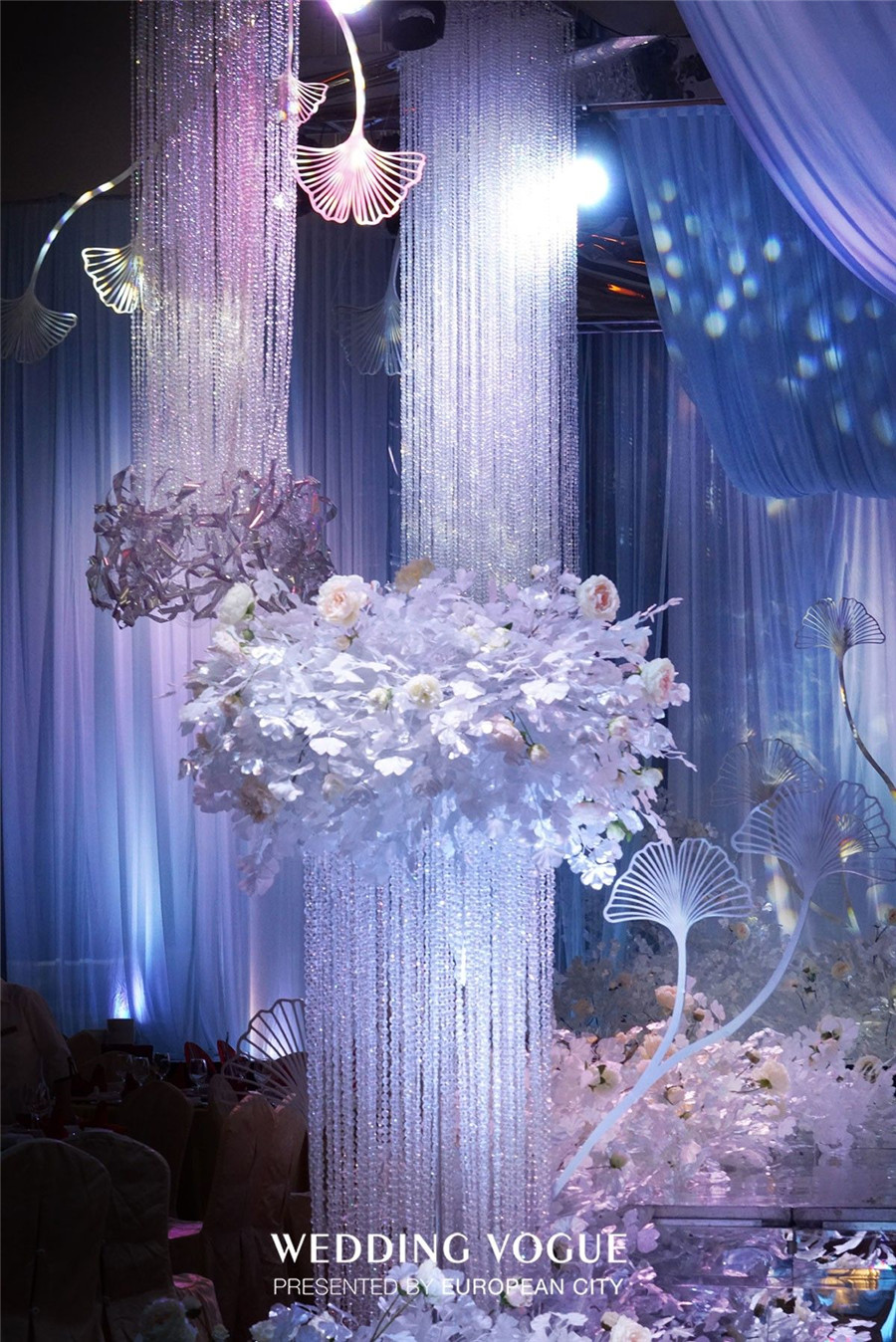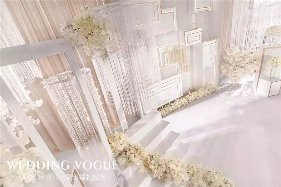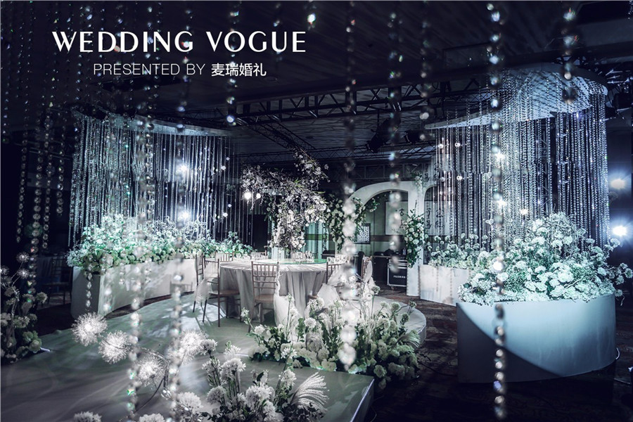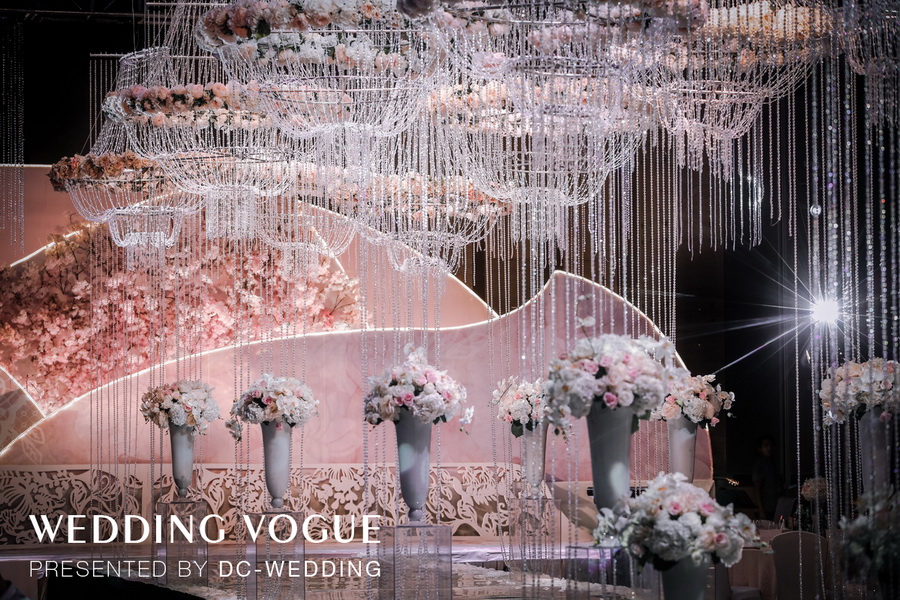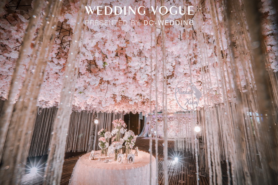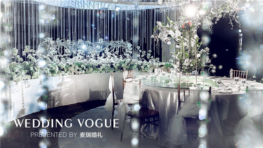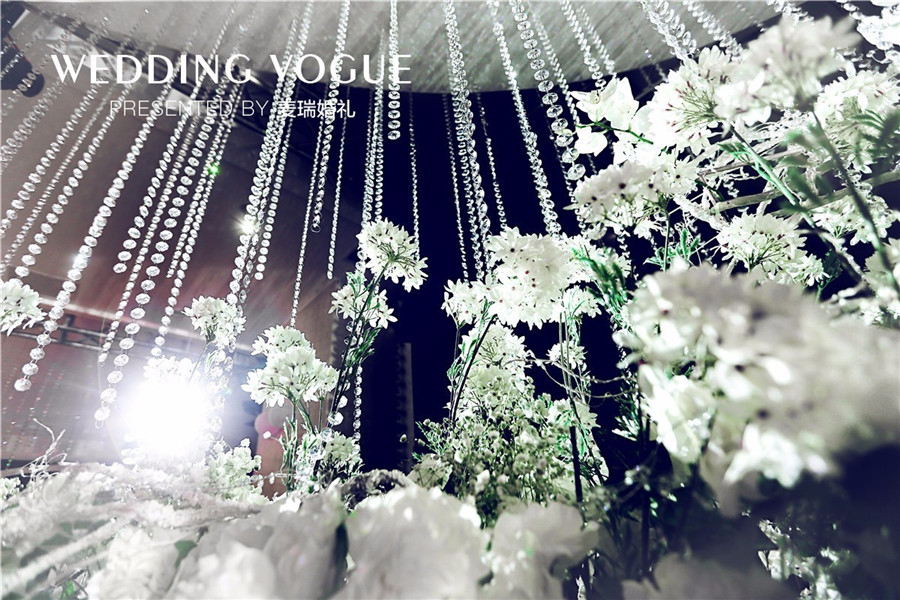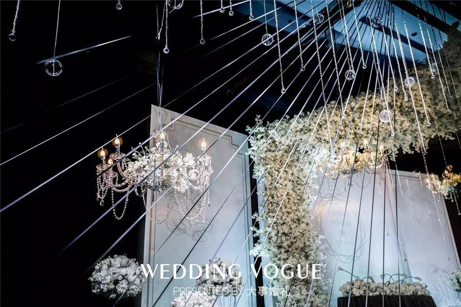 婚礼融入了水晶珠帘,白色花艺等简单的元素。