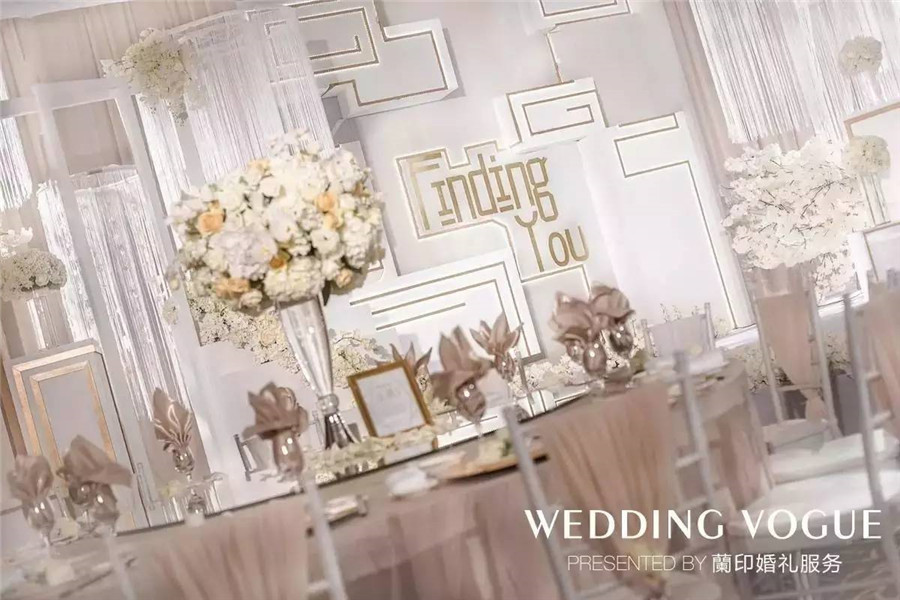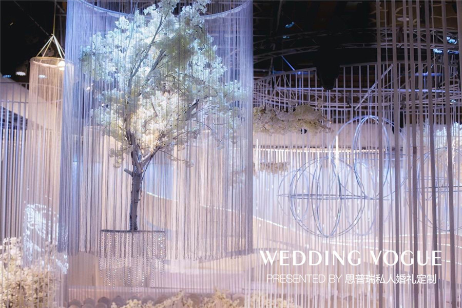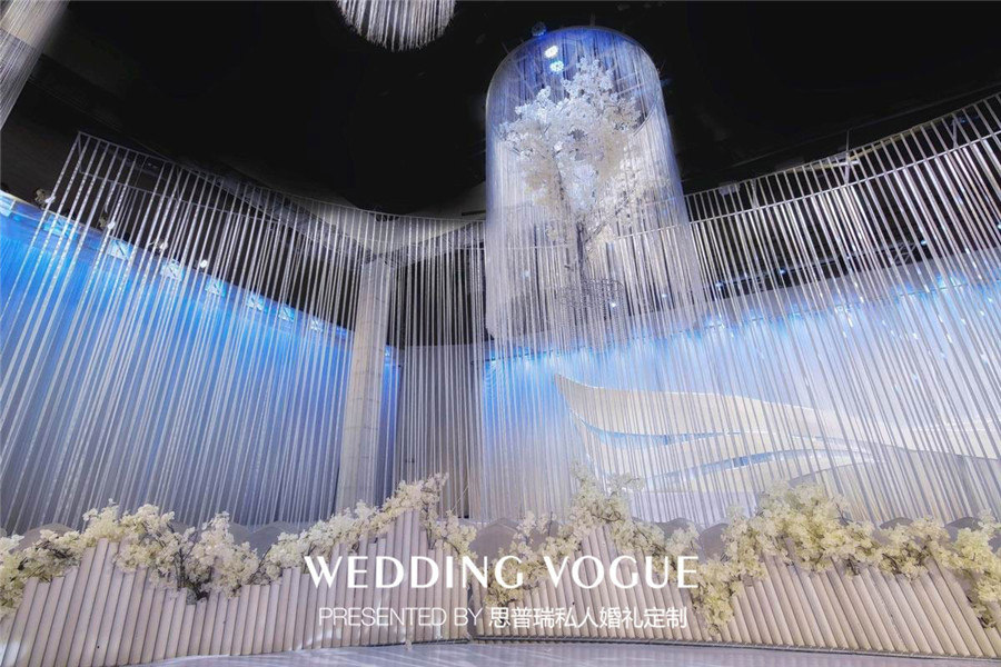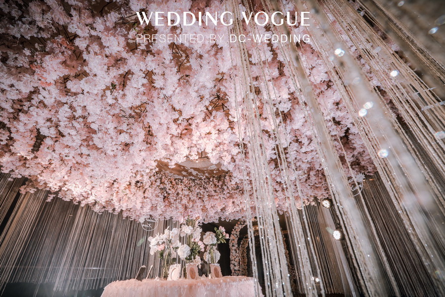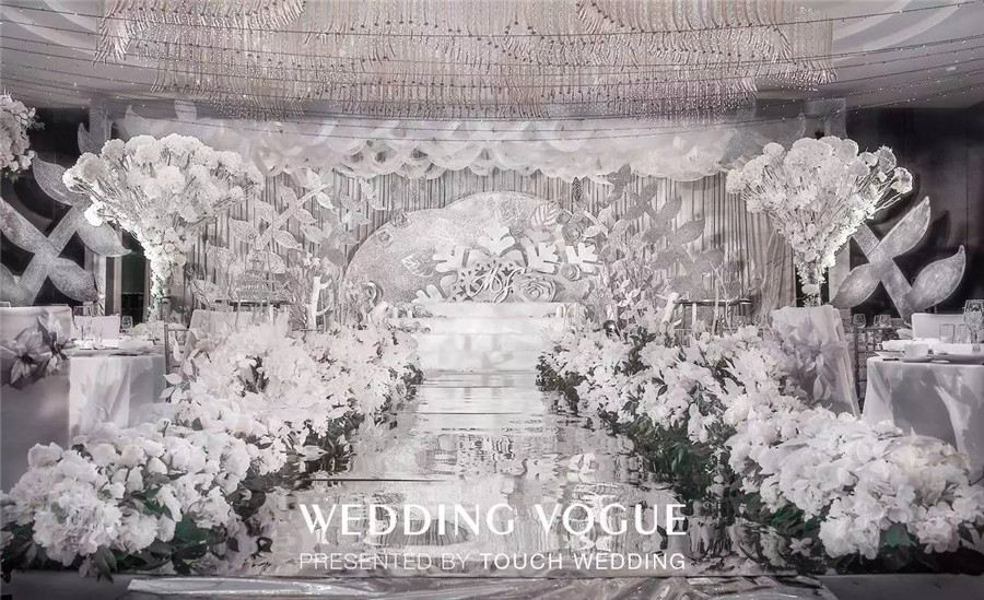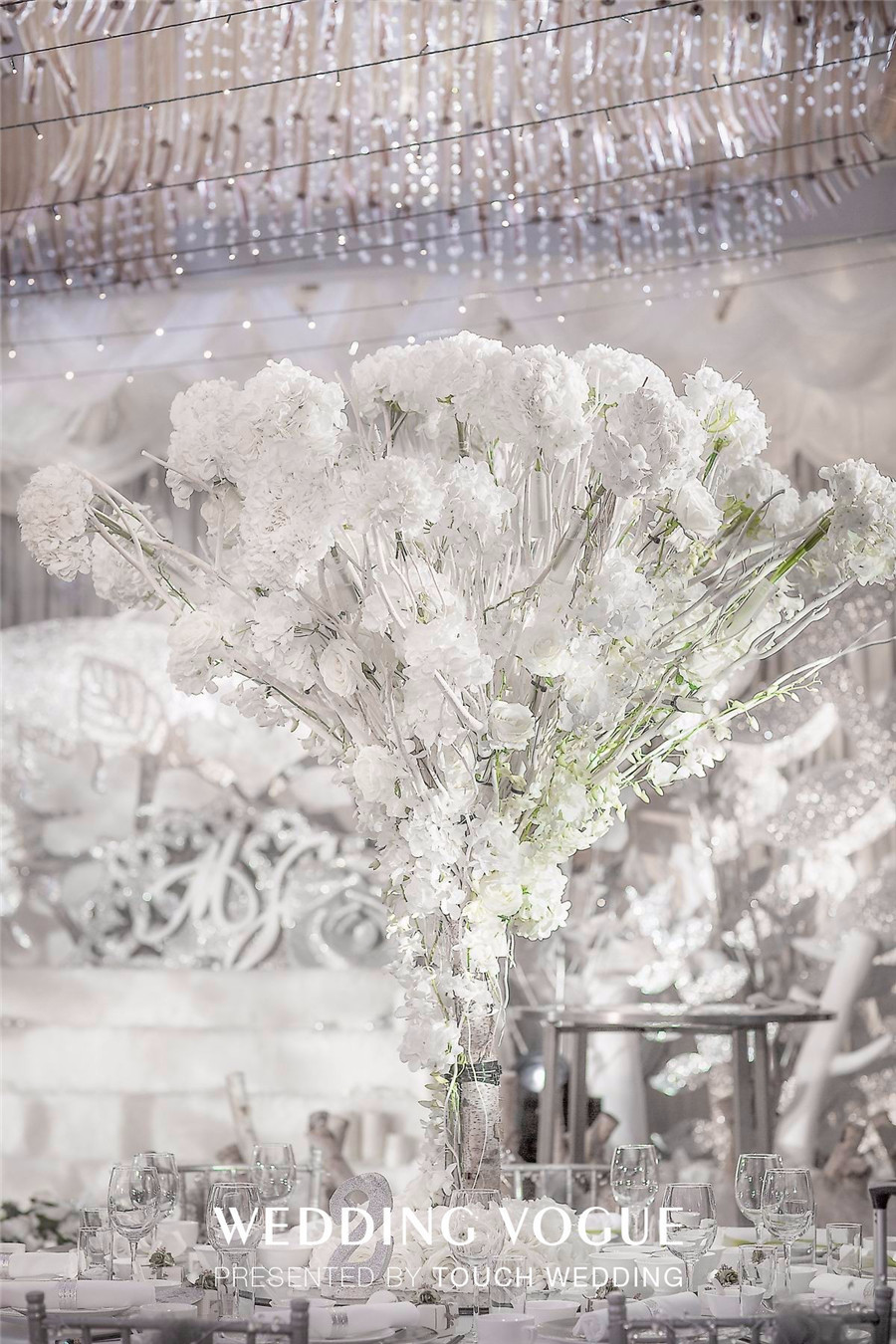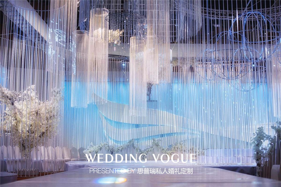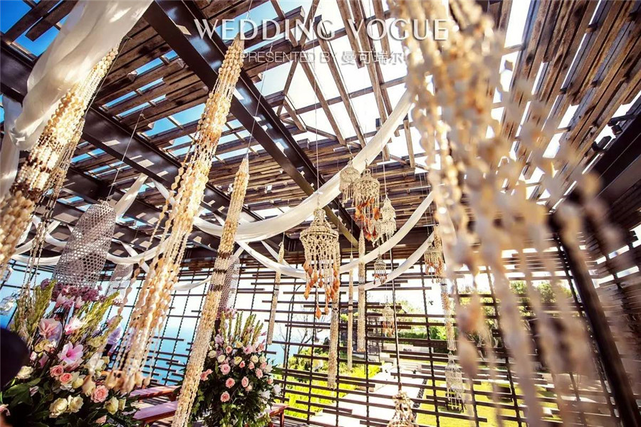 婚礼融入了水晶珠帘,白色花艺等简单的元素。