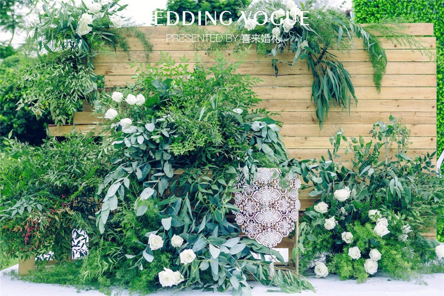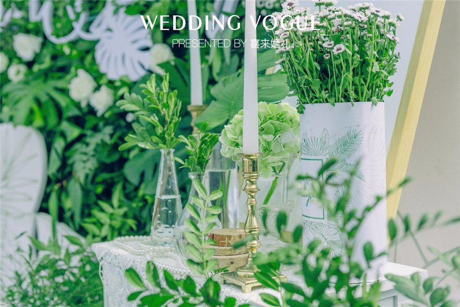 白绿的色彩搭配以叶材和常见的质朴花材的形式出现,