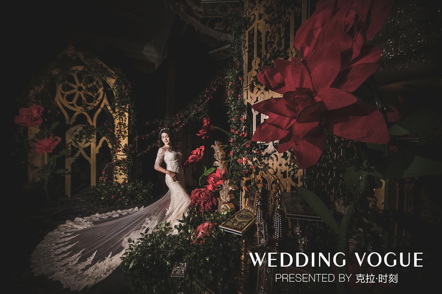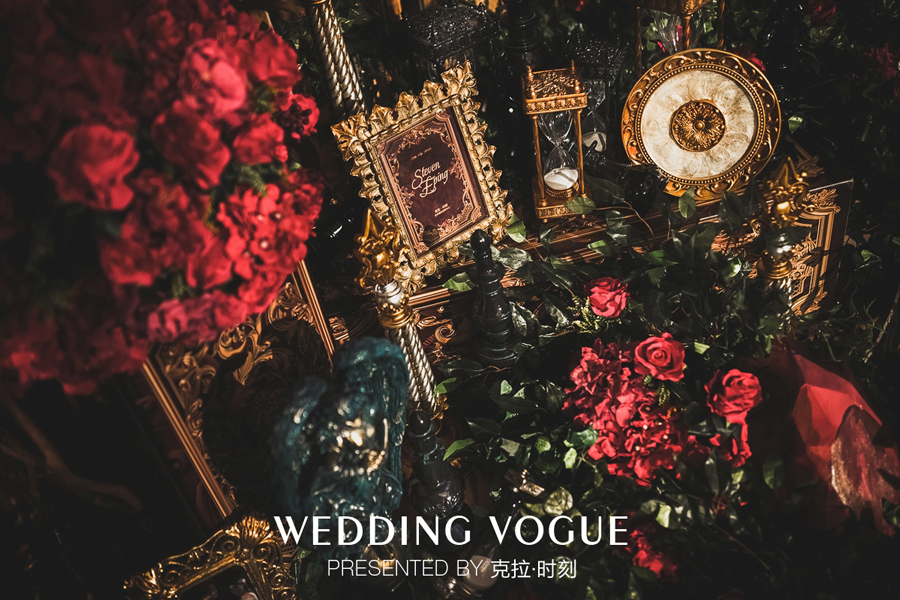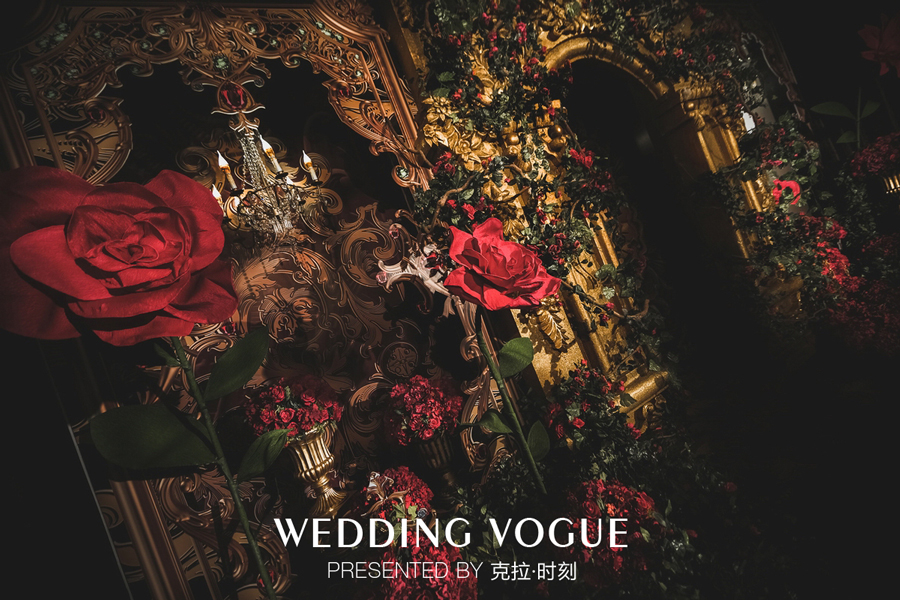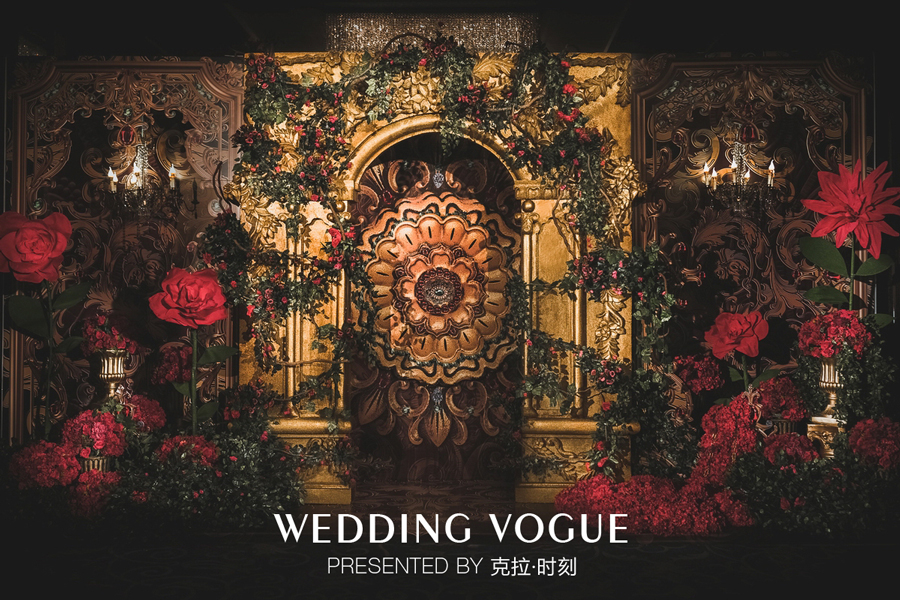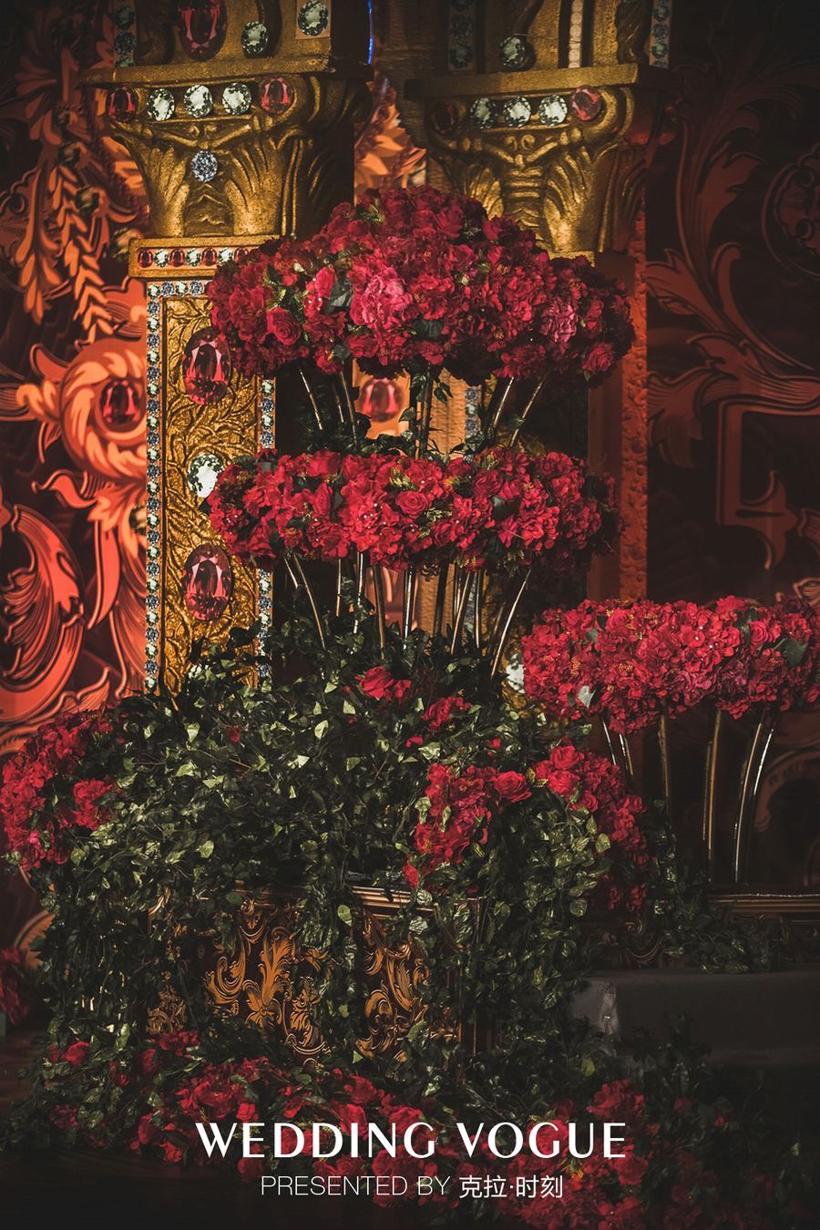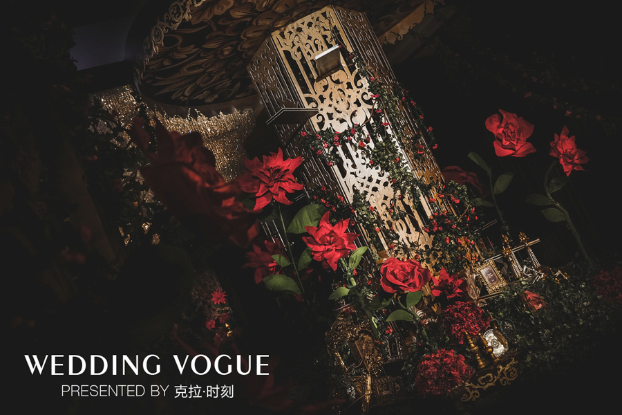 克拉·时刻作为这场婚礼的策划团队,首先尊重新人的婚礼需求:复古和红色,考虑到婚礼整体的氛围,决定整个设计走的是巴洛克复古风格。布置上引用厚重的文艺复兴晚期到巴洛克风的过渡时期的建筑结构,搭配攀爬的藤蔓和蜿蜒在藤蔓上盛开的红玫。