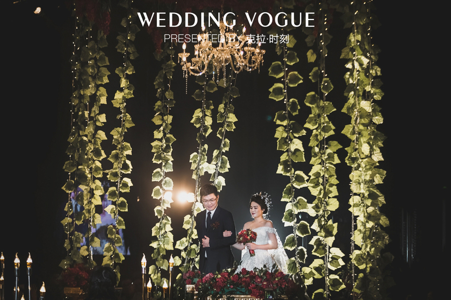 在倾听新人背后的故事时,会联想到周杰伦的电影--《不能说的秘密》,电影整体为文艺、复古风格,前半段是校园式的清新,后半段却非常大气磅礴。与新人爱情经历不言而喻,开始时安静懵懂的爱情,后期却爆发着着强大的力量。克拉·时刻把这种力量隐喻为红玫绽放的力量,融入在布置中。运用墨绿藤蔓和红玫,营造出红玫突破框架,冲出牢笼的最终盛放的力量感。