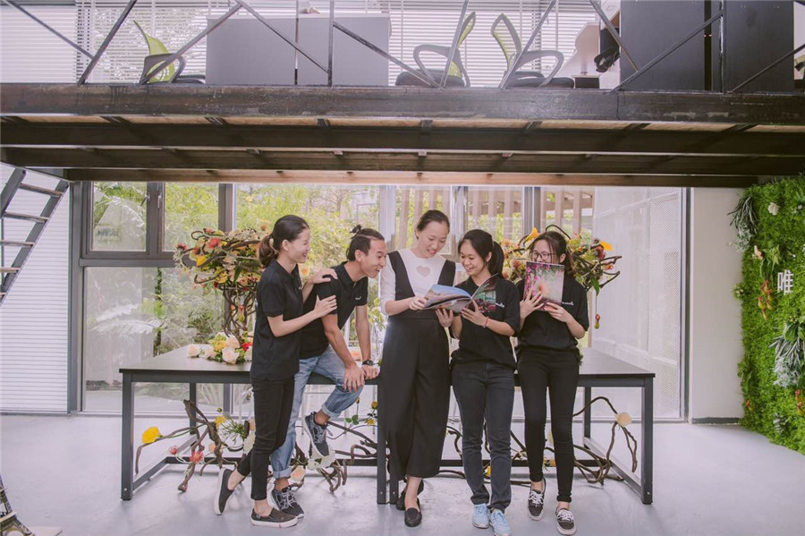 ▲Jenny(中)与她的团队在三亚唯町秀工作室