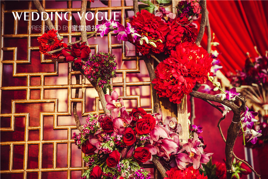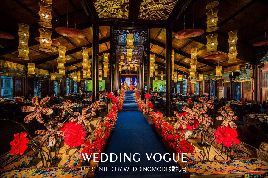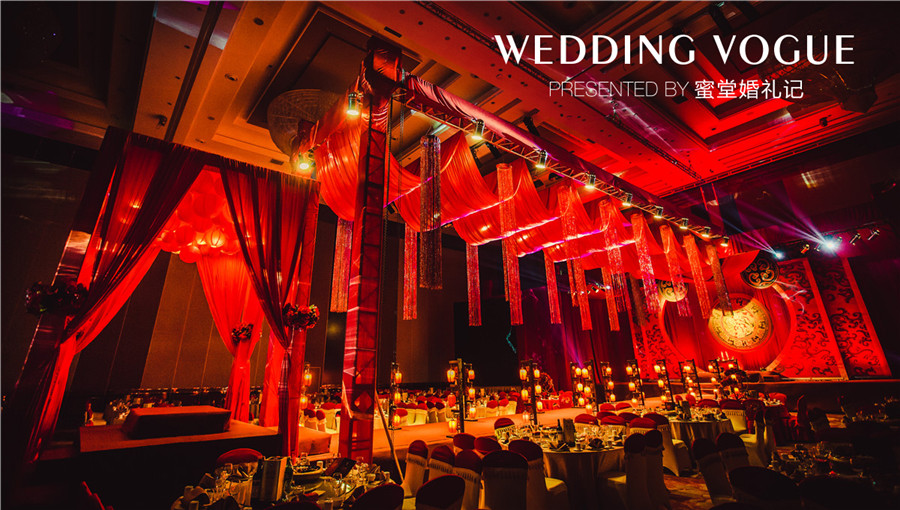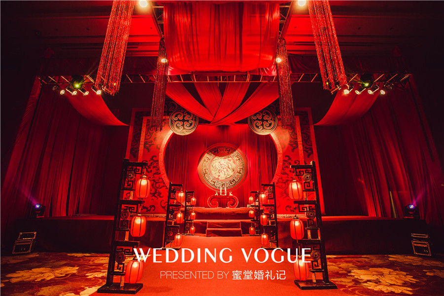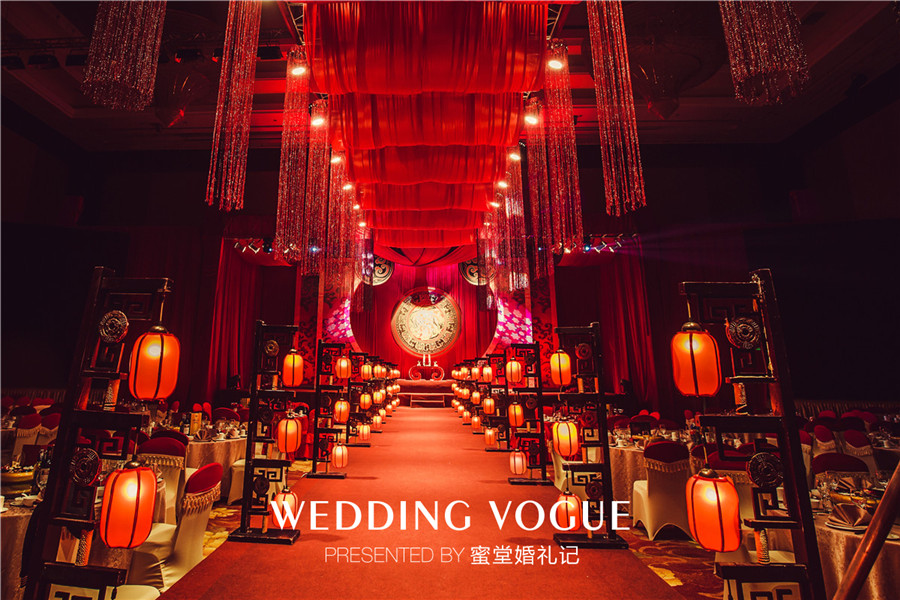 蜜堂婚礼记策划的这场中式婚礼中不仅采用了大红色的纸灯笼来烘托气氛,还在T台部分作为路引放置了仿古落地宫灯,让整个婚礼显得传统大气,像是走进了某位古代大户人家的婚礼中。
