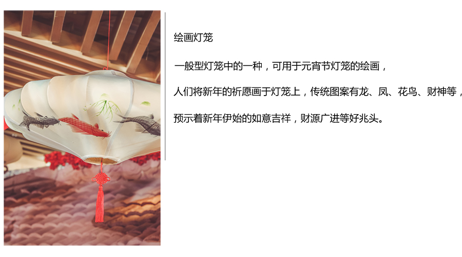 中国灯笼又统称为灯彩,是一种古老的中国传统工艺品。每年的农历正月十五元宵节前后,人们都挂起象征团圆意义的红灯笼,来营造一种喜庆的氛围。经过历代灯彩艺人的继承和发展,形成了丰富多彩的品种和高超的工艺水平。从种类上有:宫灯、纱灯、吊灯等等;造型上有人物、山水、花鸟、龙凤、鱼虫等等。