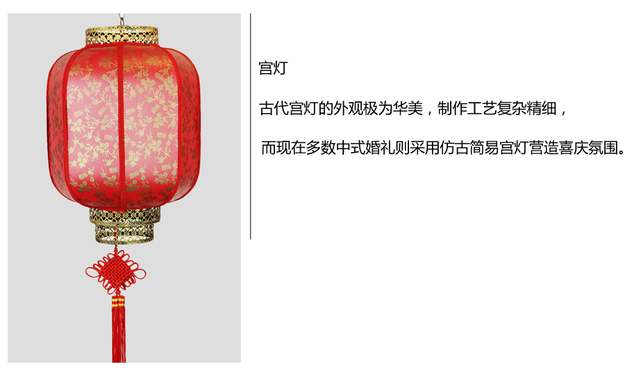 灯笼分为很多种,寺庙,客厅,住宅,大门。材质也分为多种多样,木质,竹编,丝绸,棉布,铁质。颜色也是五花八门,金色,红色,绿色,蓝色,许多灯笼寓意广泛深远。新中式会用到简单的、竹编的、木质的元素去相结合。如果是秦汉中式婚礼,则会用到大红灯笼,来体现气势和喜气洋洋,夸张的表现手法。
