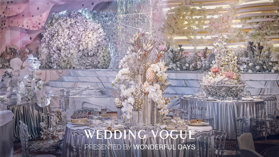 这场婚礼秀采用了浅灰色和粉色为主色调。灰色在婚礼中不是很常用的颜色,但是它不像黑色会让人觉得沉闷,也不像白色让人感到单一。Wonderful Days婚礼定制认为未来几年灰色会是大量运用到婚礼当中的一种颜色,而粉色是公认的婚礼味很浓的色系,将具有婚礼属性的粉色和优雅的灰色融合在一起,呈现出既梦幻又干净的感觉。