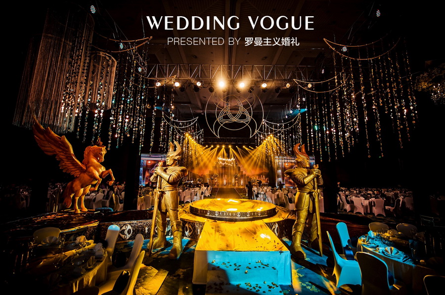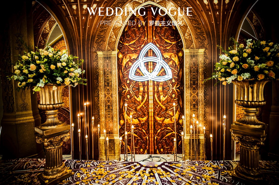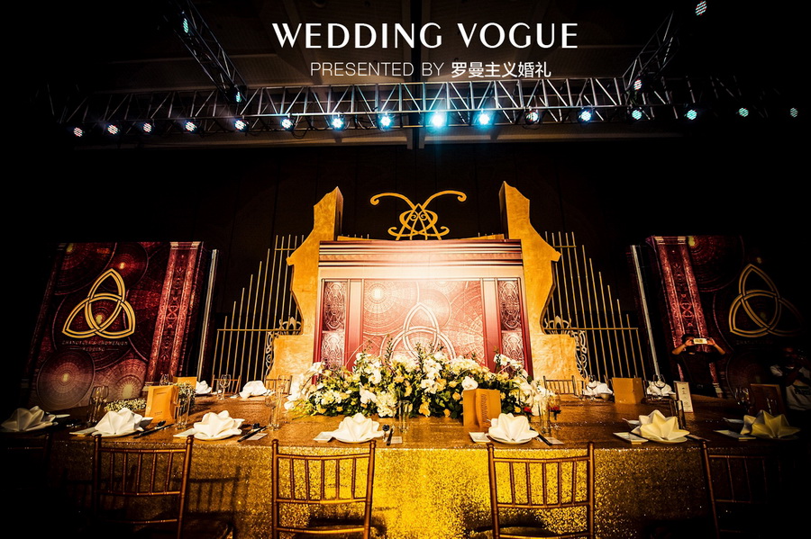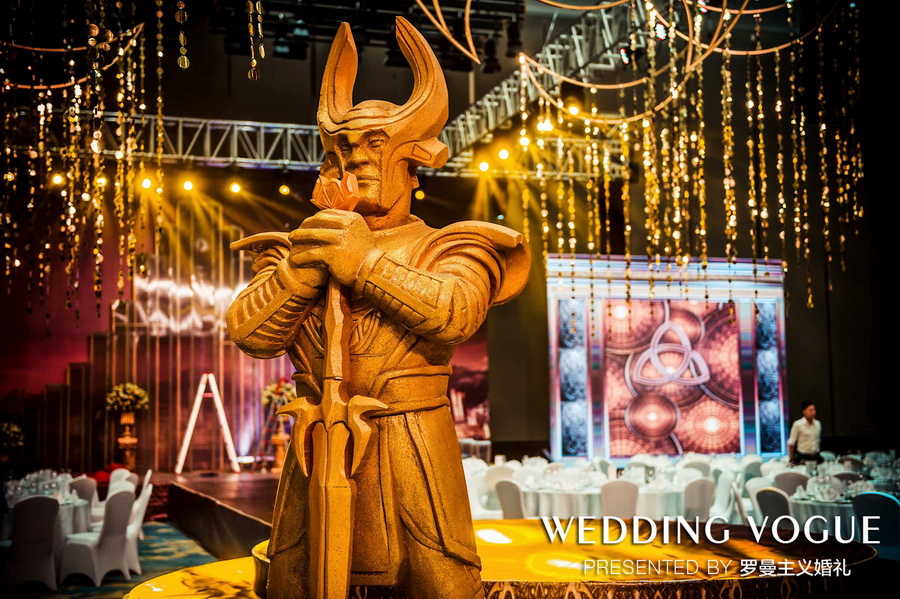 婚礼布置和流程借鉴了雷神的故事背景和角色设定来进行设计,布置以金色为主色调,采用了艺术性还原电影背景的形式来展现北欧神话中复古奢美的风格,舞台整体庄严隆重。在迎宾和仪式区等细节加入令人象征阿斯加德神域的标志性LOGO,更有原版雷神象征力量的锤子作为道具,点睛婚礼主旨。