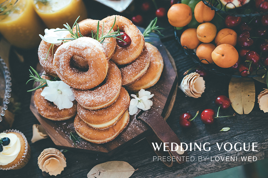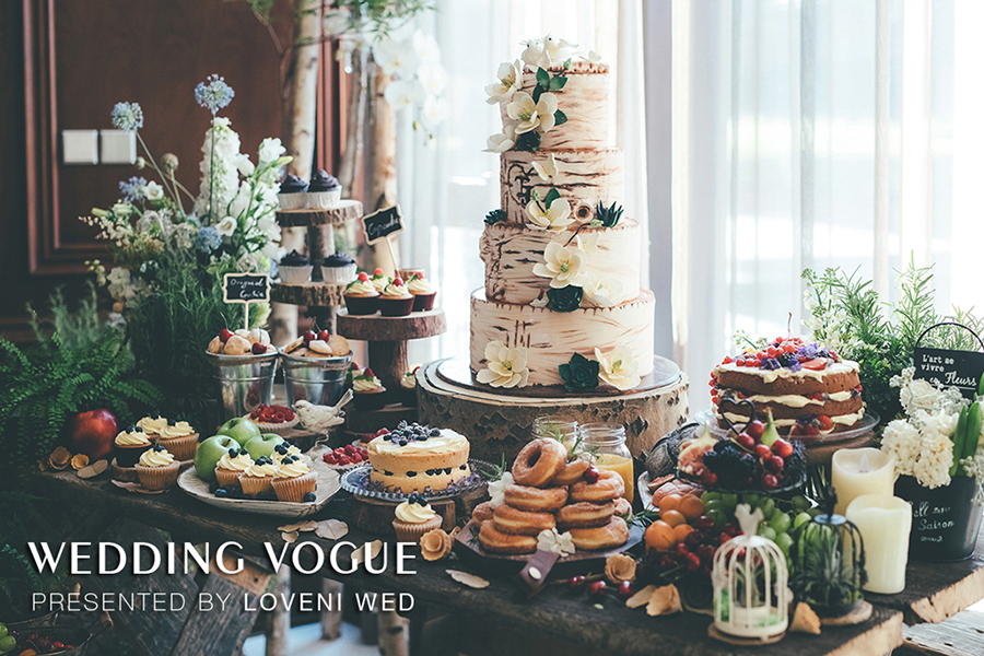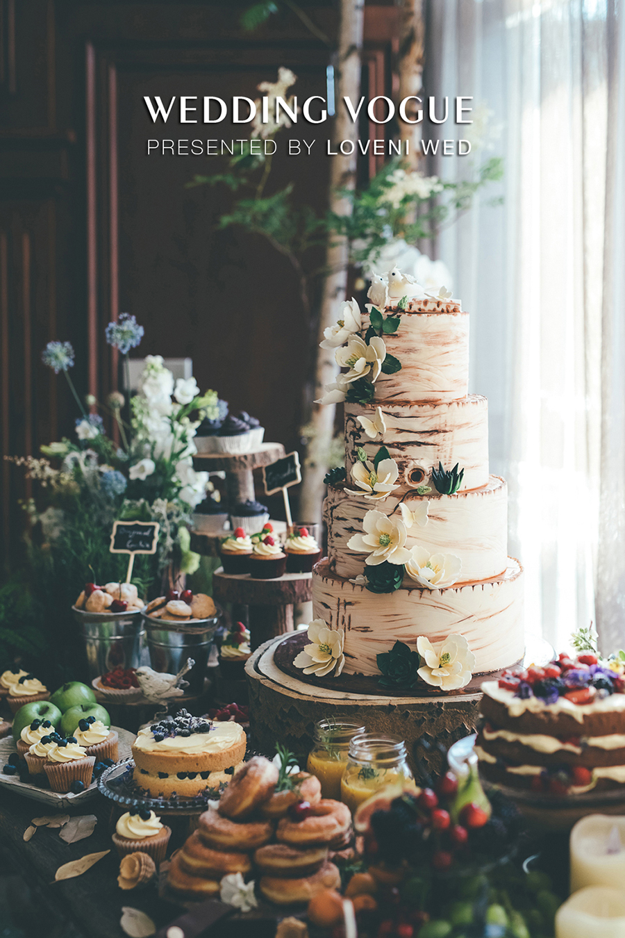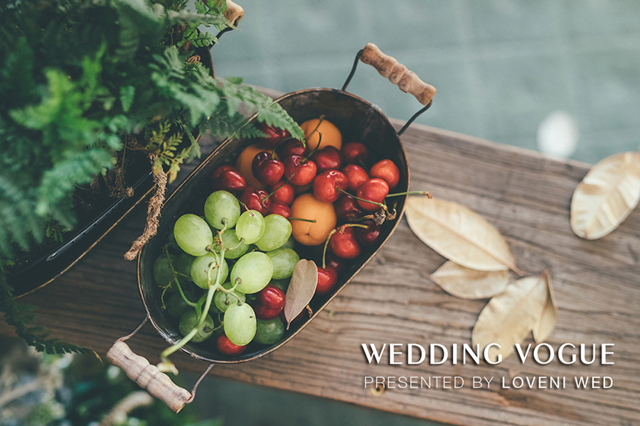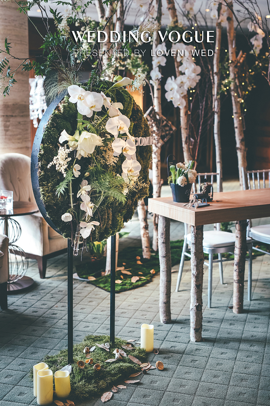 迎宾及签到区仍沿用白桦木做主背景装饰,在此基础上,加入大量绿植、苔藓、时令果蔬,面包甜点等元素,营造出复古田园,法式下午茶的惬意悠闲之感。