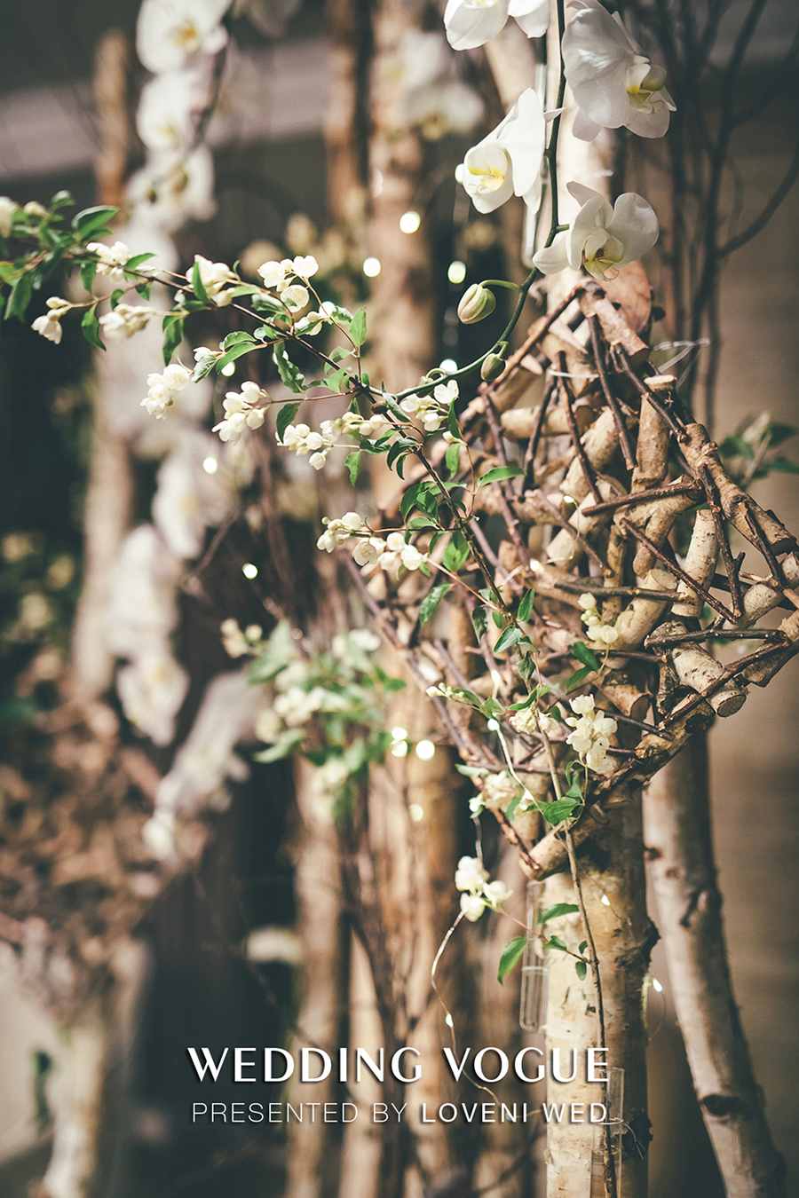 喷漆处理过的文竹,宛如冬日冰天雪地间银装素裹的雾凇,白绿从中一抹淡淡的高级灰,与白桦树暖中带冷的质感相互呼应。铜丝灯和串灯的加入作亮化设计,让整片森林更加温馨浪漫。