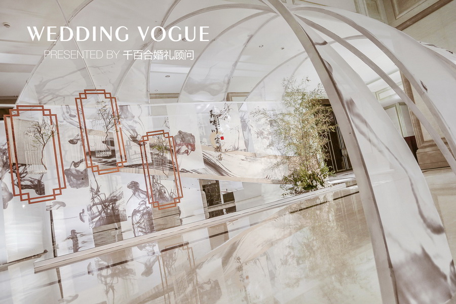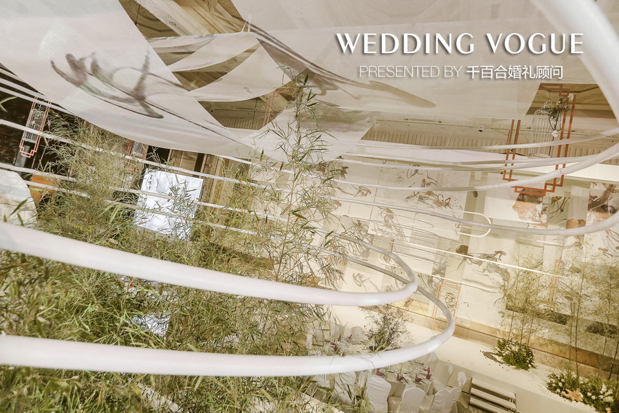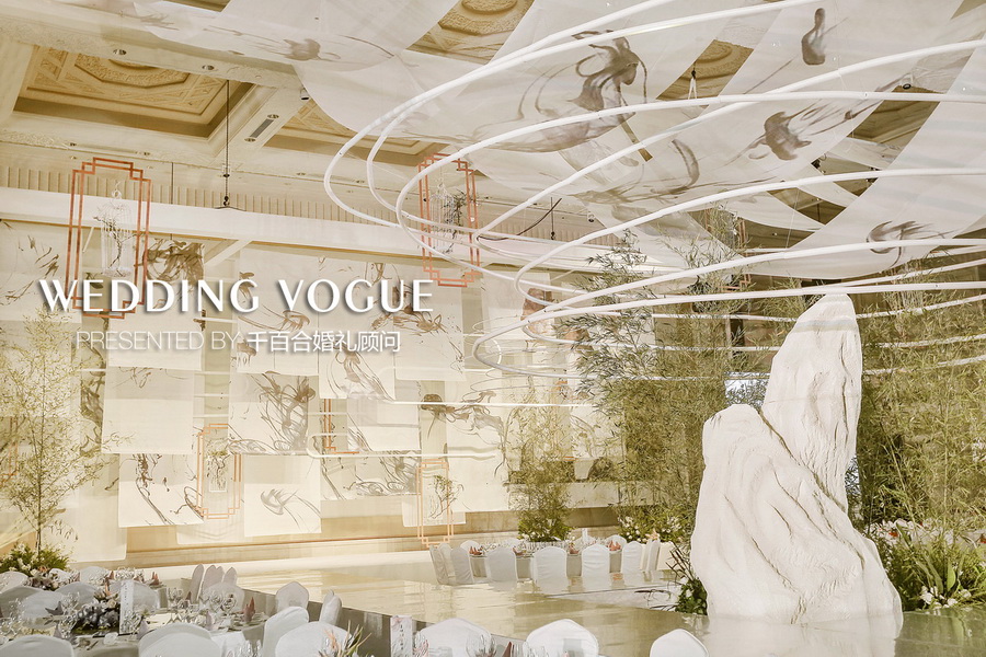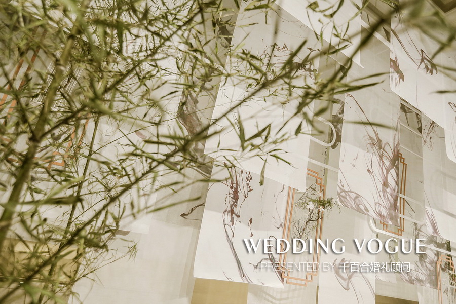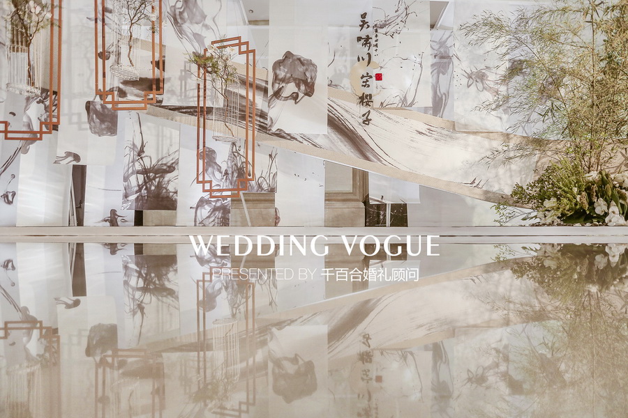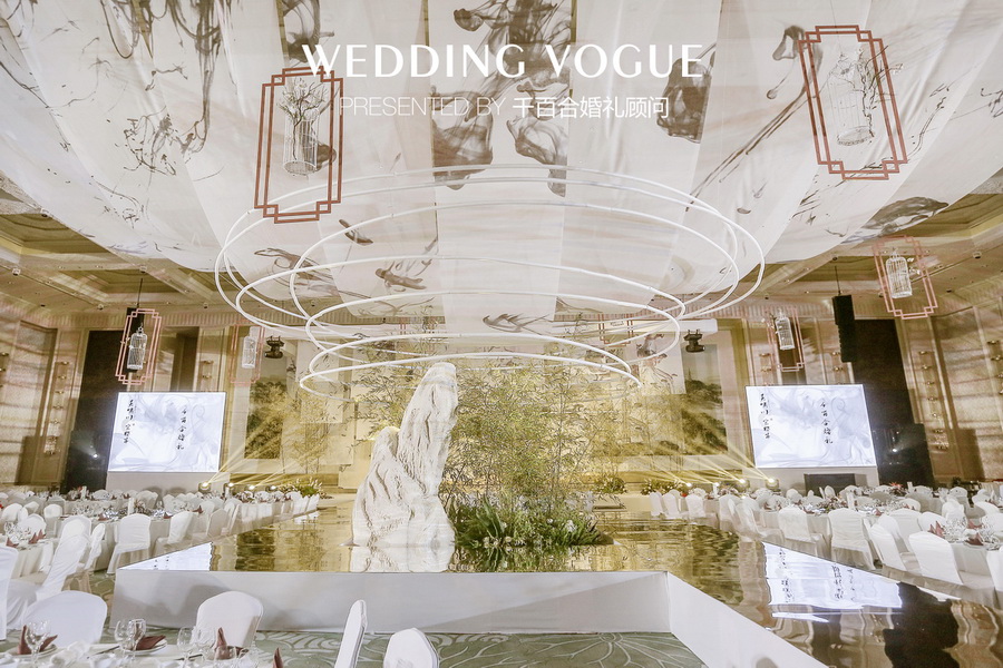 最初不少业内的朋友向新人推荐了千百合婚礼顾问,他们在与千百合婚礼团队相互沟通时,希望婚礼与自身气质相契合、风格独特,提出运用中国画中的元素塑造婚礼古典庄重有含有生动气韵的氛围。