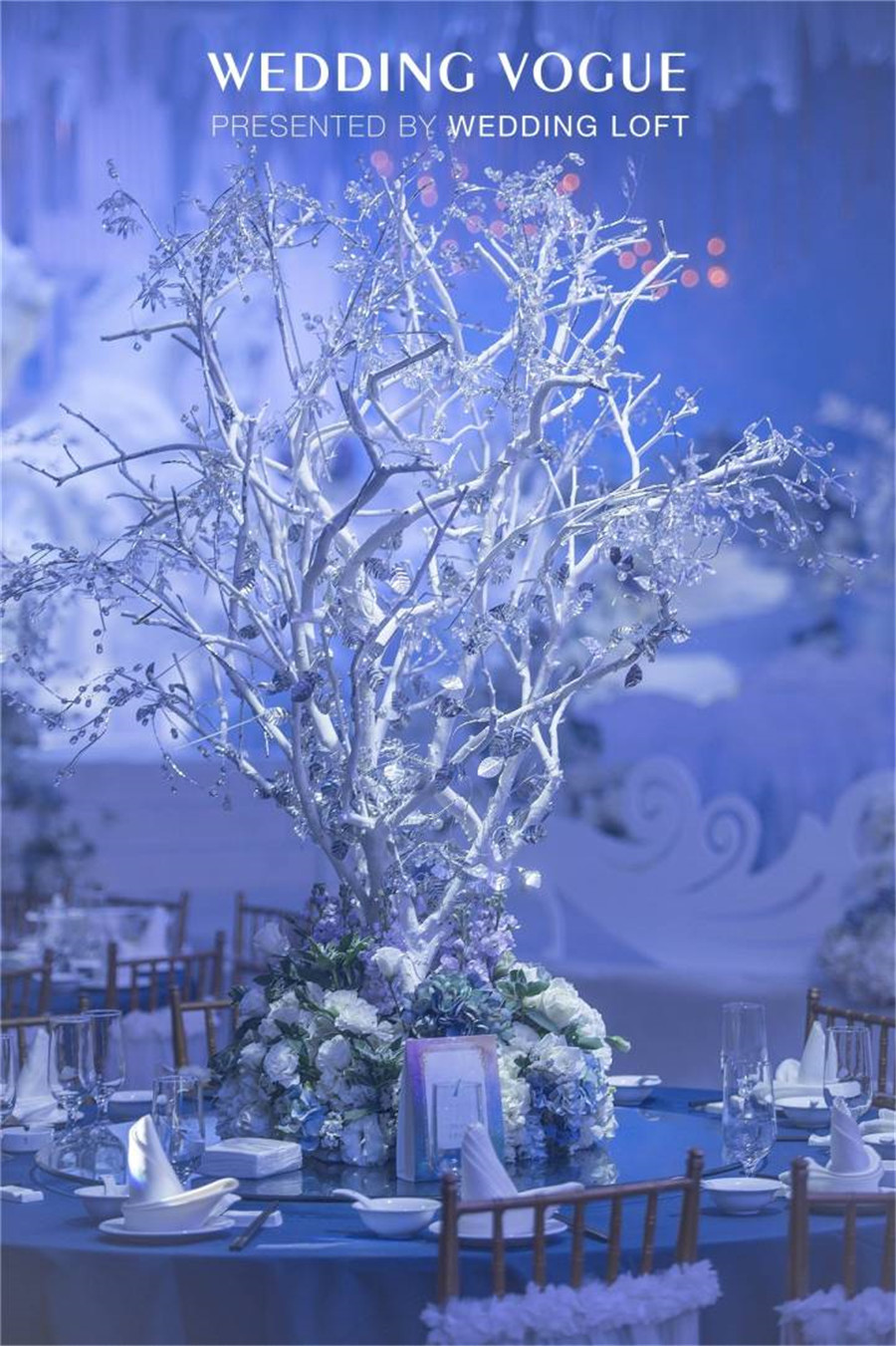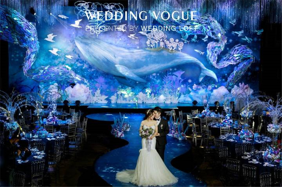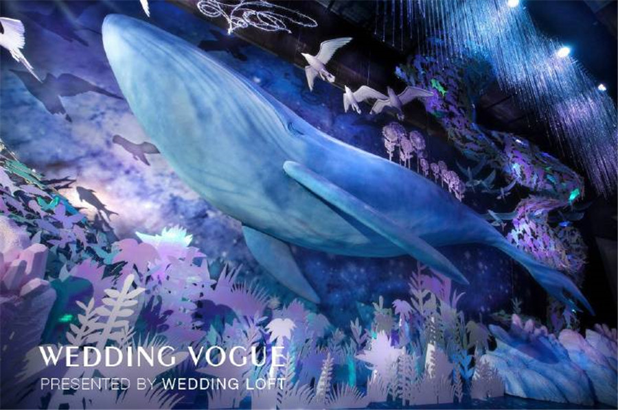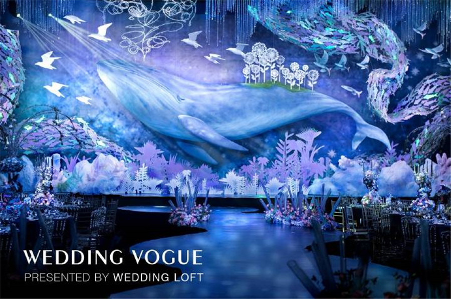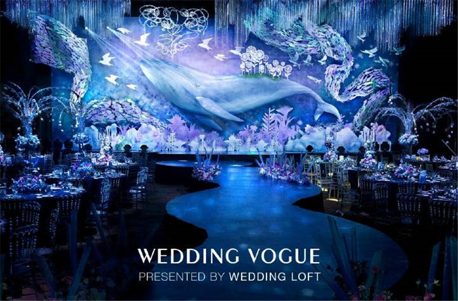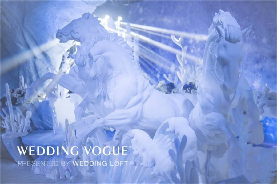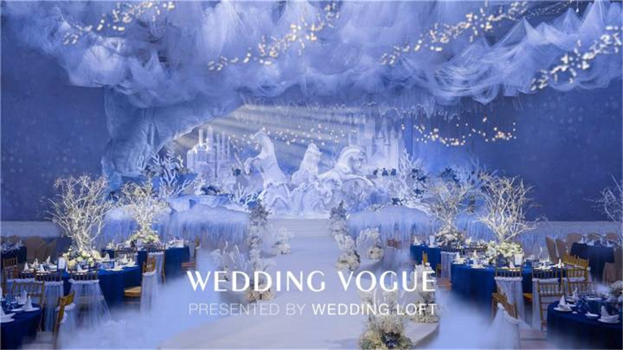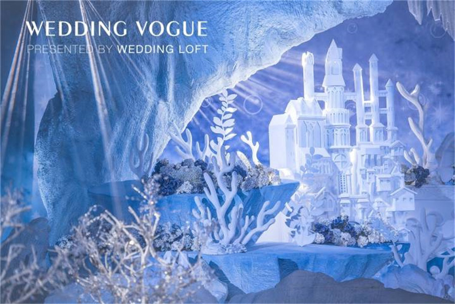 那海底最为常见的珊瑚枝,可以柔化夸张用来点缀暗潮波涌的海底世界,增加一丝柔美之感。浮游生物增加婚礼的梦幻效果,白色的水晶花束类比珊瑚,海浪似的T台,搭配蓝色桌布的整体效果,和金色椅子来补色提亮,吊顶是阳光投射过厚厚的冰川所折射进来的阳光。