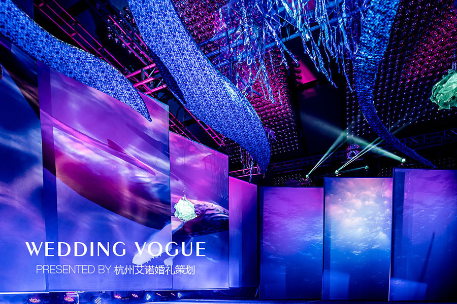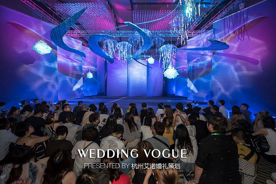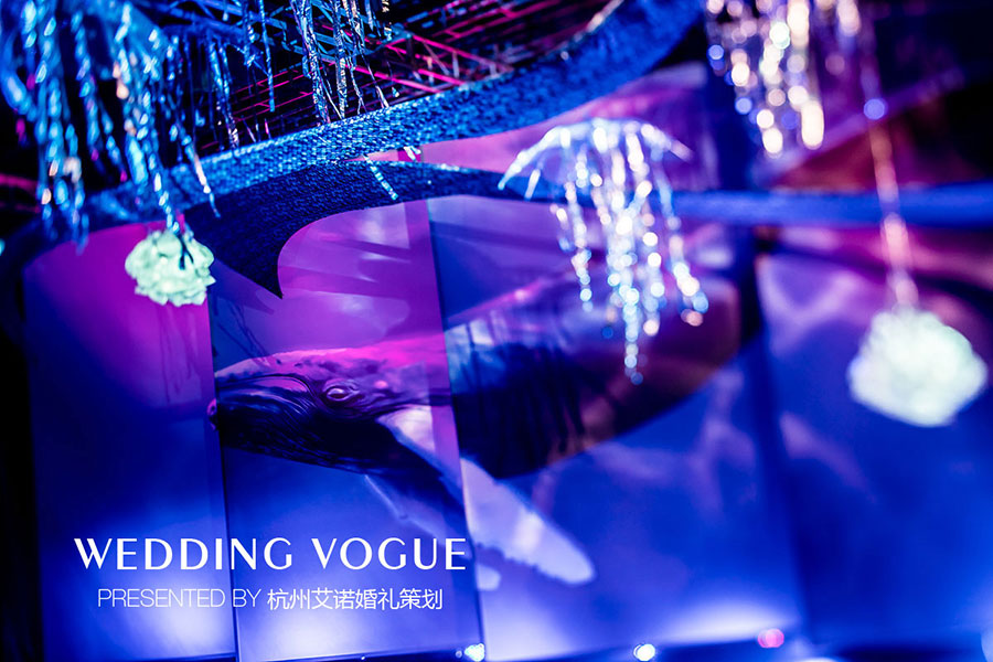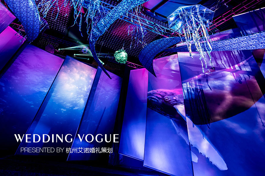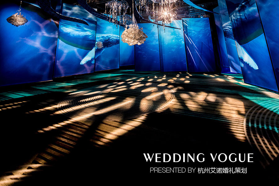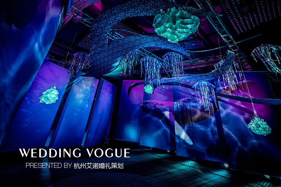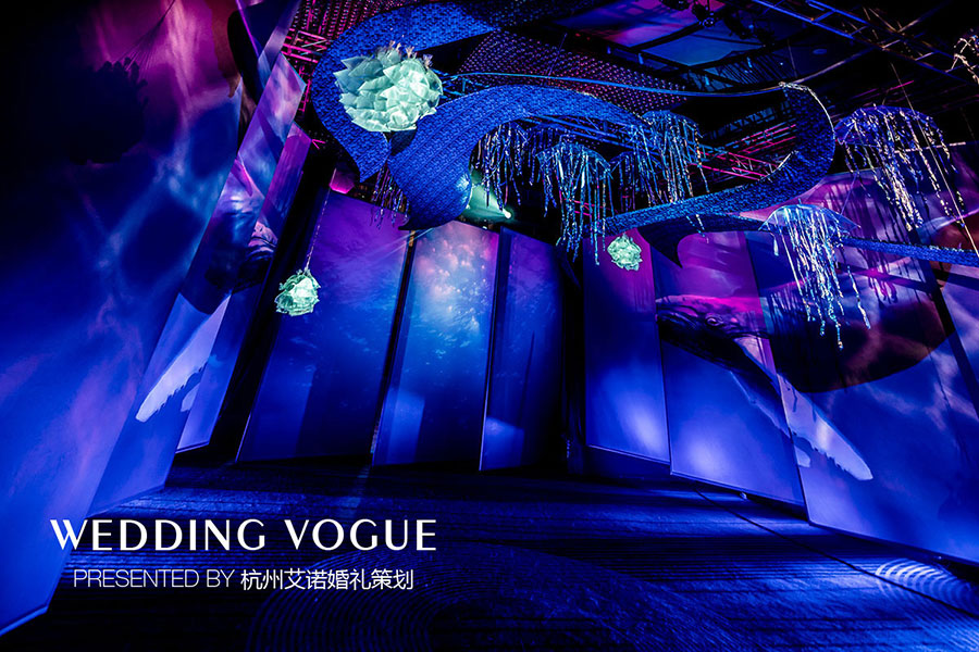 进入主题《温度》的宴会设计发布的现场,首先展现在眼前的是一个深邃的海底世界,吸引人眼球的鲸鱼视觉,自由的鱼群和水母,一切震撼而安静.......