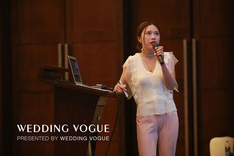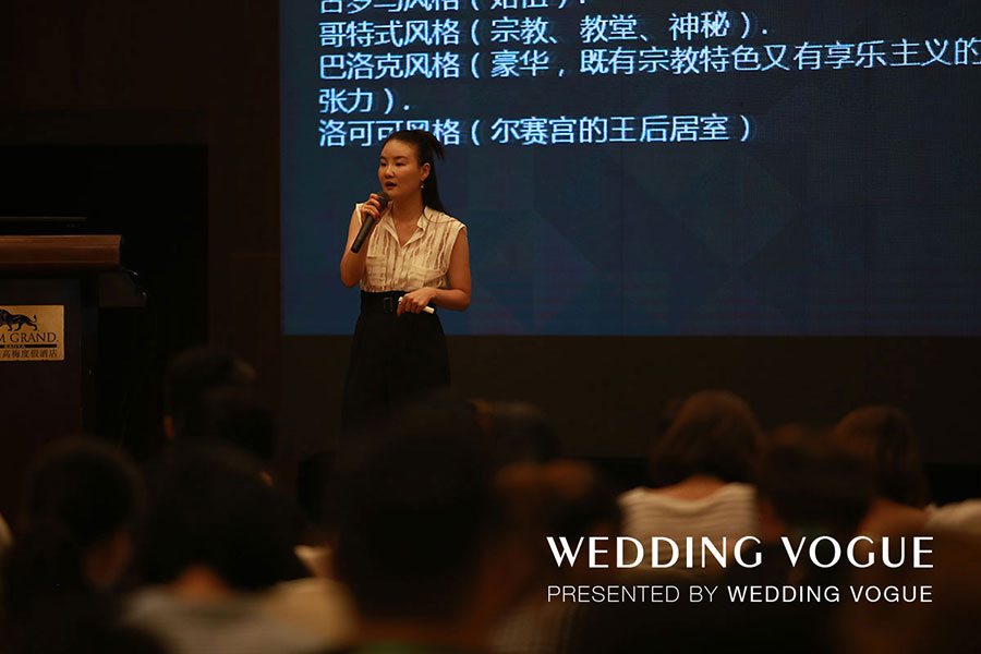 三色锦高端定制婚礼创始人思岐,讲课风格热情饱满,用自己的语言从自身经历出发讲述婚礼人的种种心路历程,以及围绕四种设计风格:欧式古典、时尚现代、花园风格、异国风情,并从配色,图案,元素,花艺等方面做一一解析。