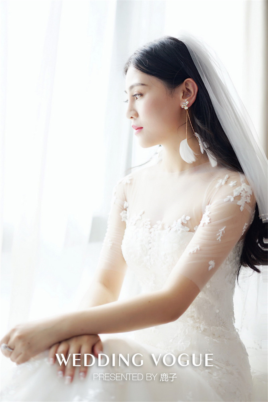 鹿子依然坚持简单最美的原则,给小茉搭配订制了最符合她婚纱和整体气质的手工羽毛耳环,鹿子在追逐当下潮流的同时,也会把经典元素融入到造型中,经典永流传。