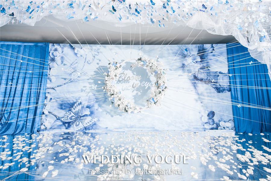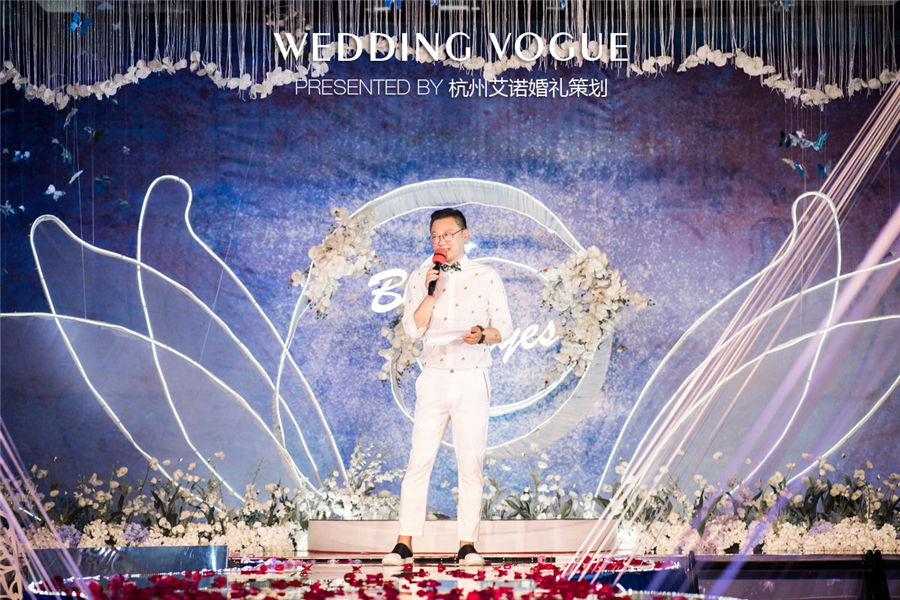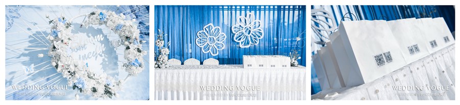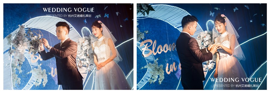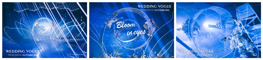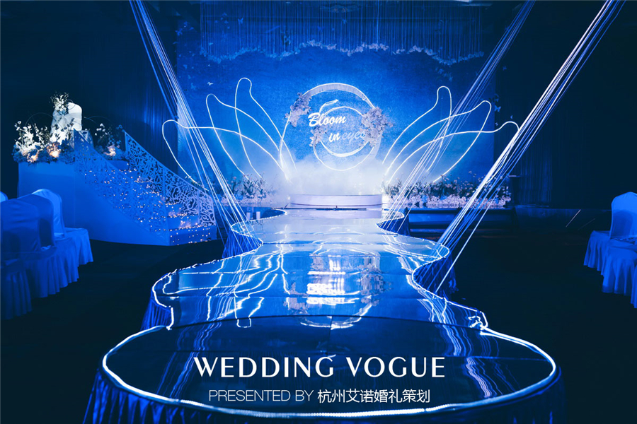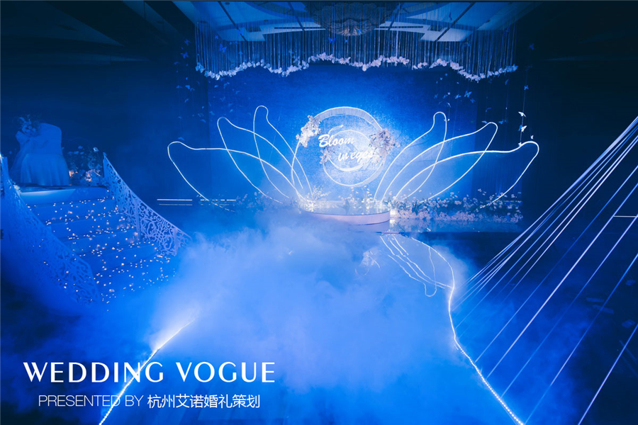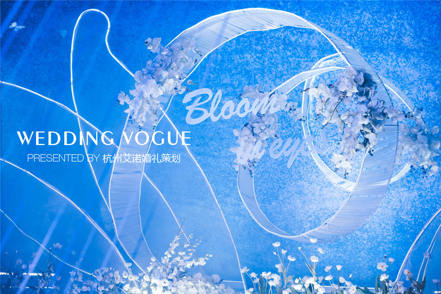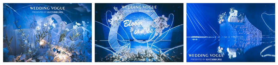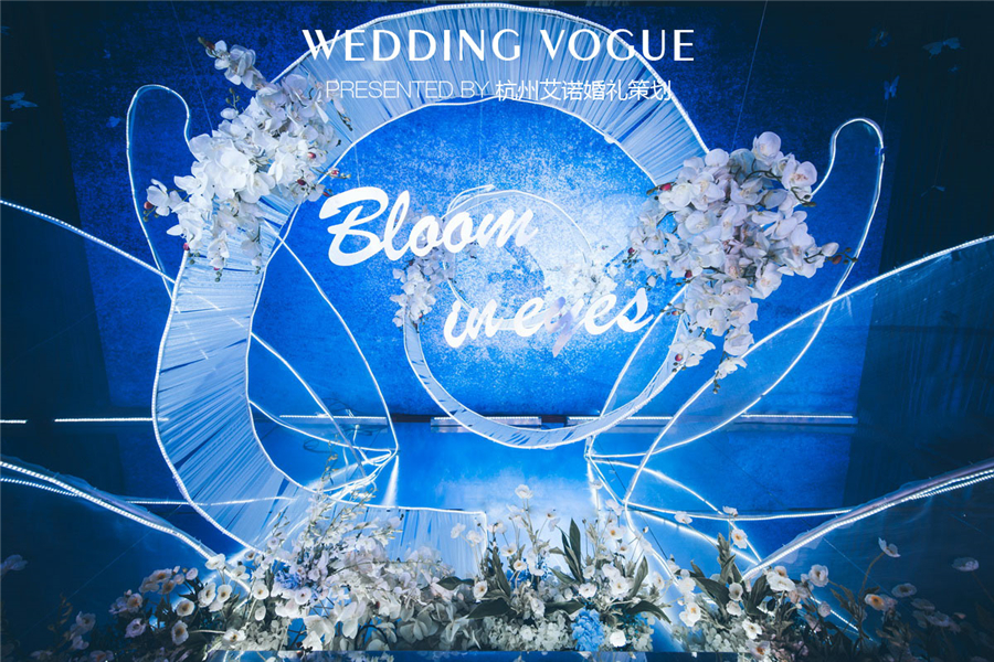 走进开元,穿过蓝白色调的迎宾区,步入婚礼秀现场,一股清凉感扑面而来。婚礼秀的时间安排在8月份,炎热的夏季,作为婚礼策划机构,笃信爱情的杭州艾诺团队相信,千岛湖的蓝天、白云、清甜的水和清新的空气,给每对来到这里的年青人都有想要自由呼吸和恋爱的感觉。所以,婚礼秀选择蓝白色系,主题则元素采用了绽放的花朵,寓意情感如心花怒放,为情而动、为爱而开。