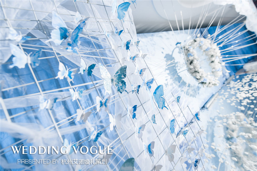 “你若盛开,蝴蝶自来。”迎宾区的蝴蝶装饰正迎合了这句话。发散的缎带代表盛开花朵的气味,一只只手工染制的蝴蝶则象征着门外的蝴蝶被盛开的花朵吸引,期待着婚礼秀的开场,起到了抛砖引玉的作用。