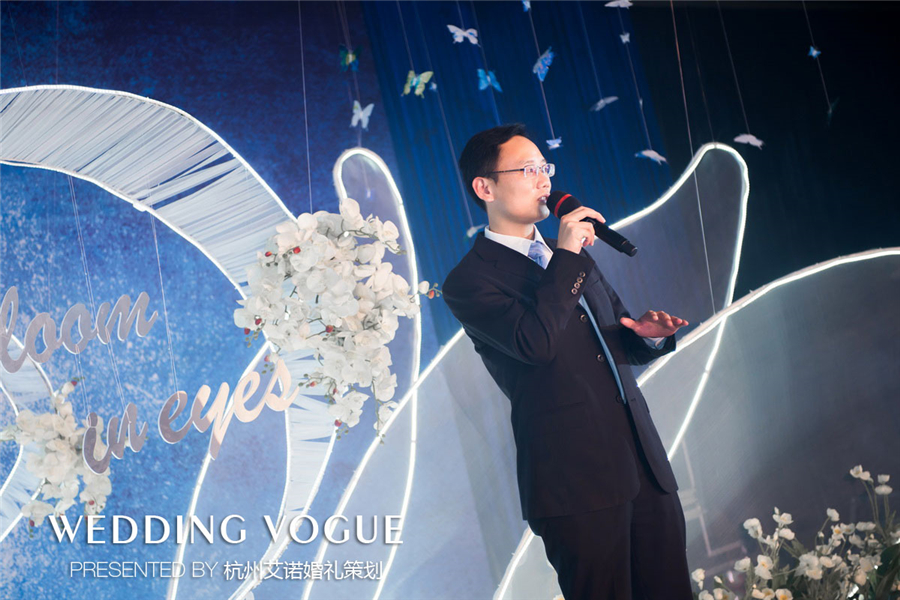 这场婚礼秀的流程,是由杭州禧阅司仪团队创始人孙磊根据《盛放》主题策划而成,他希望呈现出一场更像婚礼的婚礼秀,让新人感受到一场婚礼的真实意境。于是,他用一对异地相恋多年的爱人平凡而又真挚的爱情故事,打造了一场融汇朗诵、歌舞、大提琴表演的婚礼秀。