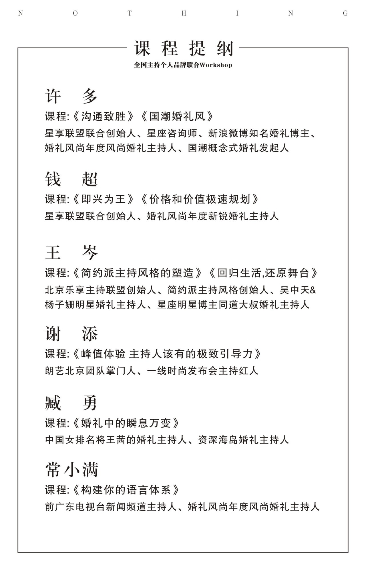 课程中我们将会来剖析,从见客户到彩排再到婚礼仪式当天,作为主持人的你该如何营造氛围,具体设计什么环节让新人有更好的感受和体验。