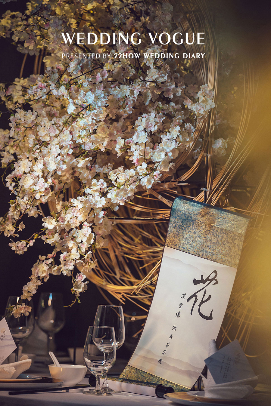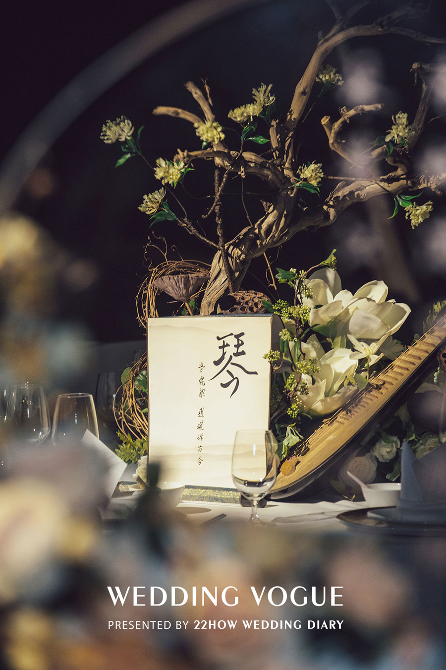 值得一提的是,22HOW团队在宴会厅设计了以中国优秀传统文化“八大雅”为主题的桌花布置,把“琴、棋、书、画、诗、酒、花、茶”每一个字提炼出来,成为一处处独特精致又充满设计感的造景。