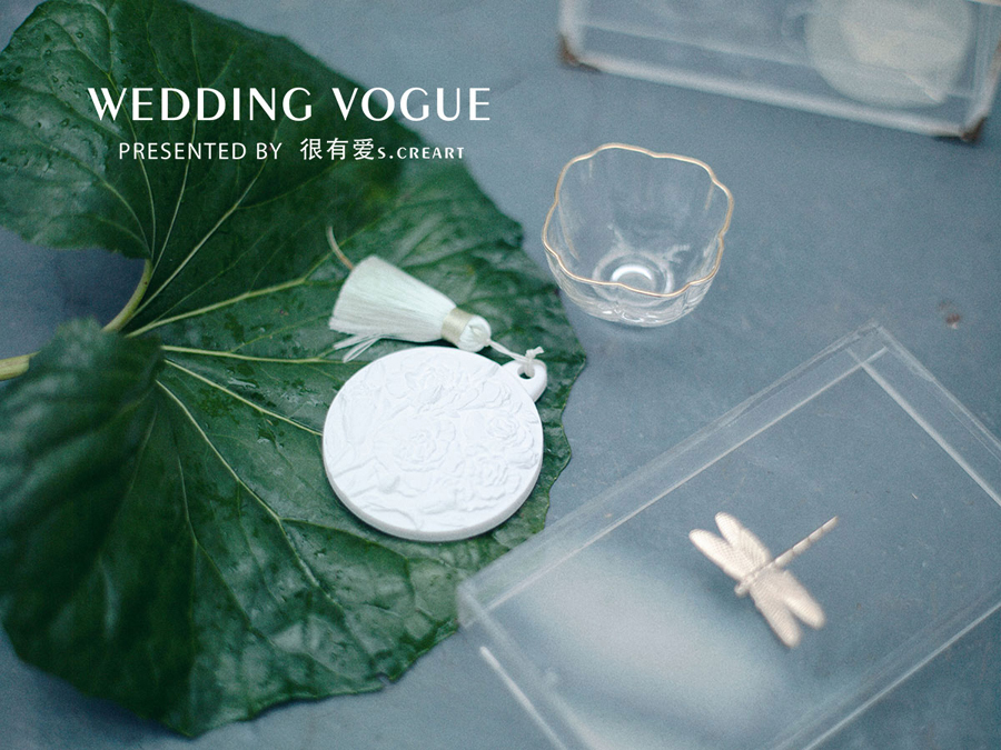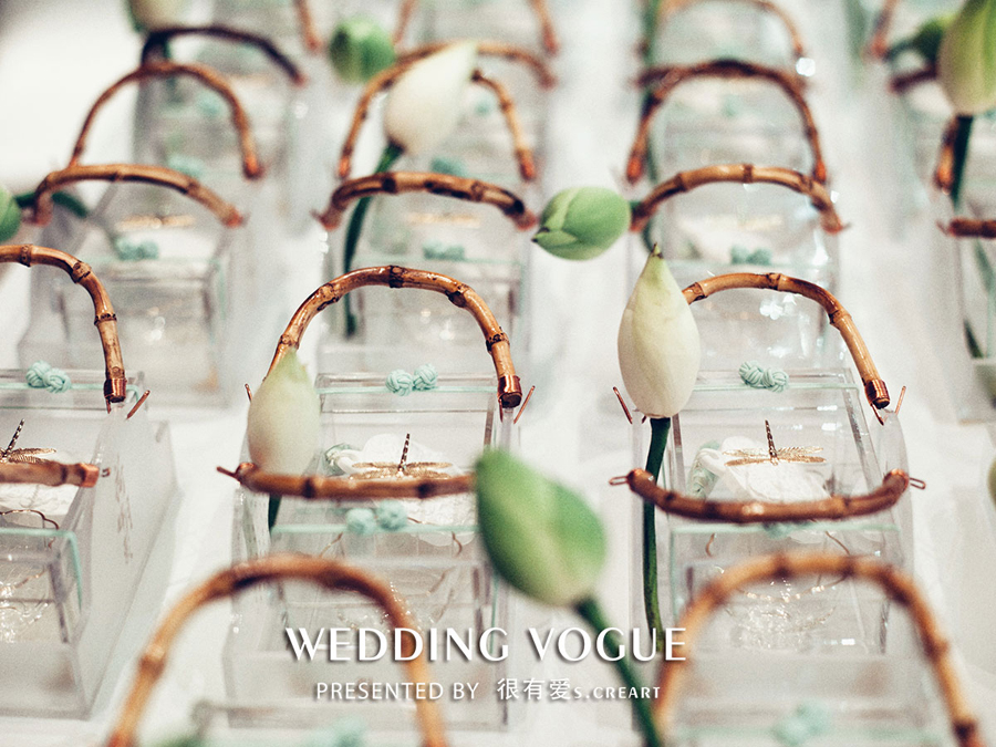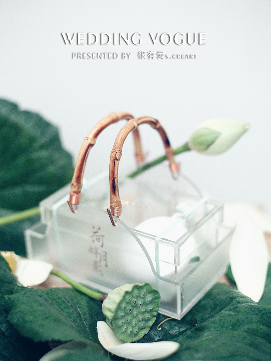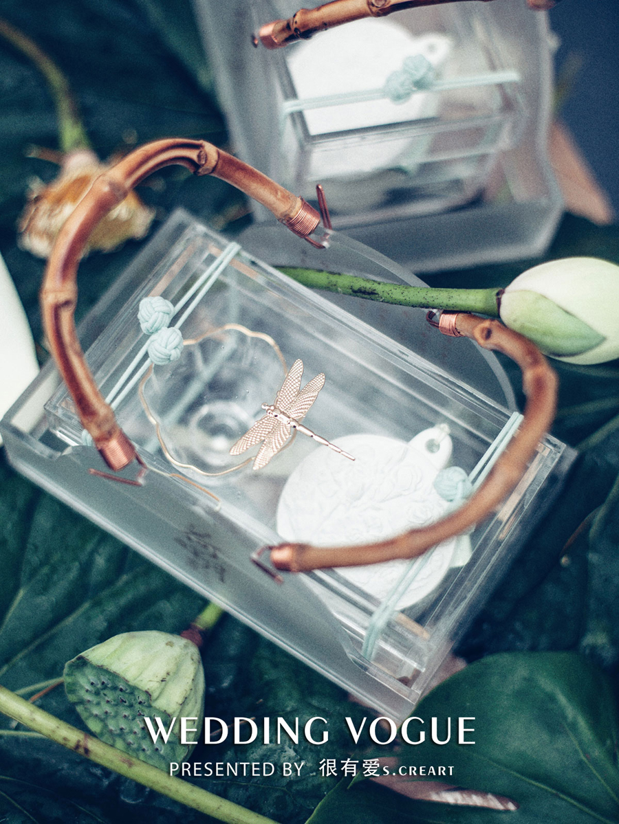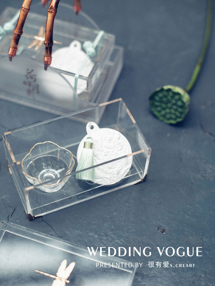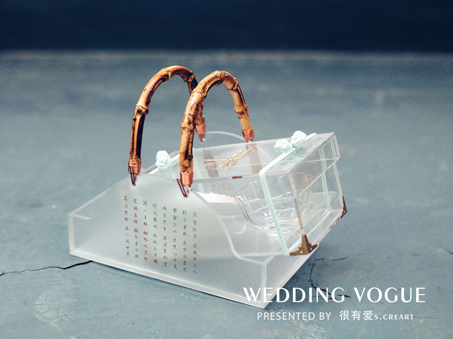 回礼来自婚品高级定制品牌——很有爱s.creart,同样延续雅致的新中式风格,全定制的一款透明礼盒,外盒从古典的“提”“携”“挽”中汲取灵感,手柄处采用了竹节元素与盒身透明质感及金色配件呼应亦不缺乏时尚感。