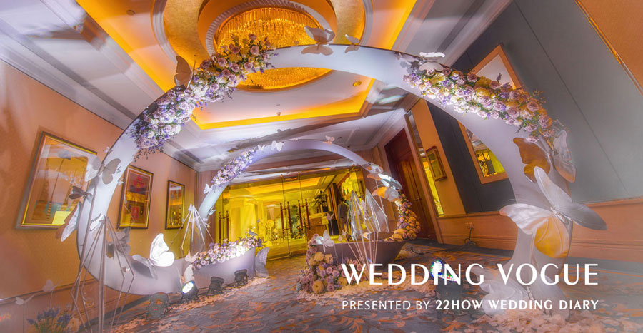 首先在签到处,就可以看到采用蝴蝶和丝带围绕的螺旋形入口,22HOW婚礼团队特意模拟时光隧道,还原了恋爱的3个不同的甜蜜经历,更是把接下来的3个场景做情感动线的串联。