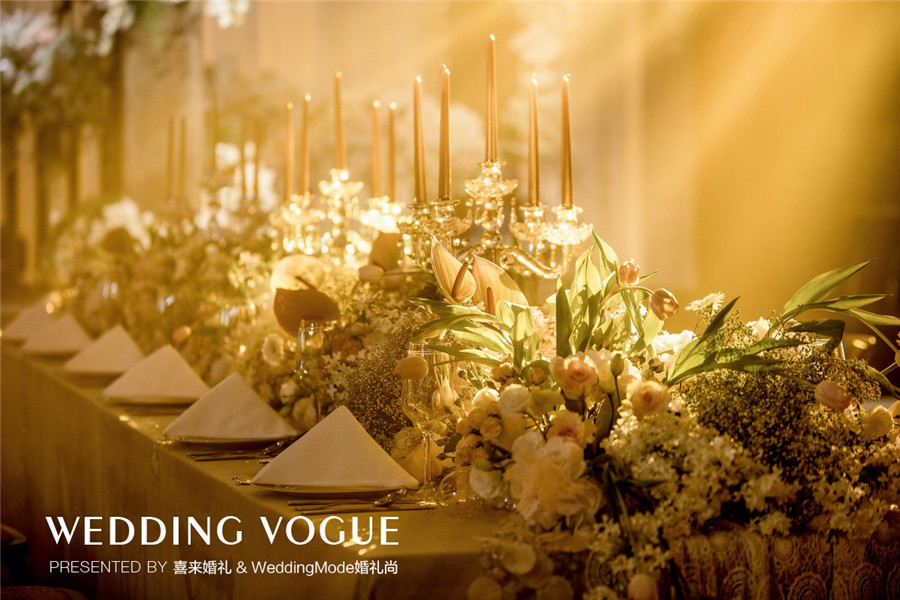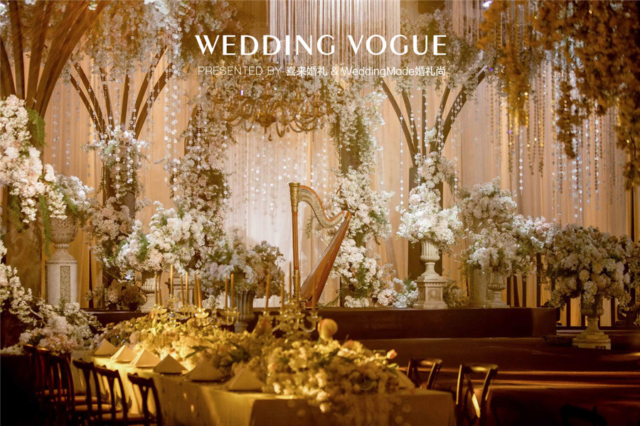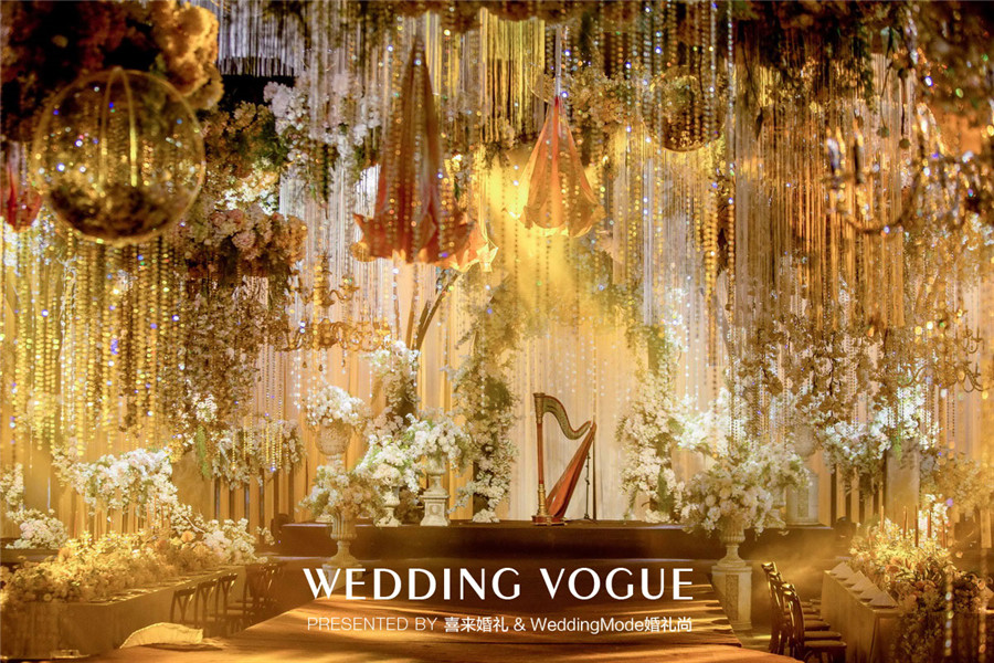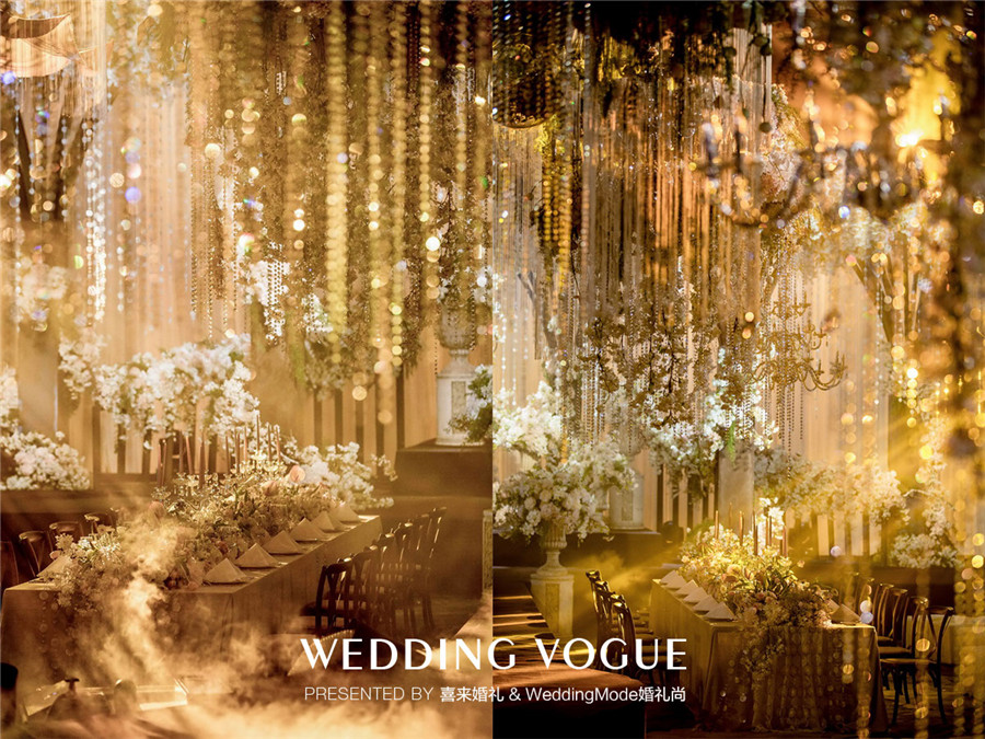 在婚礼设计中,特意借鉴了电影中绝美的元素,比如利用鲜花打造丛林的感觉,利用水晶、烛台等金色元素打造奢华氛围,让来宾仿佛潜入魔境中的奥兹国,花间迷雾,景致朦胧,步入人生梦境一般。