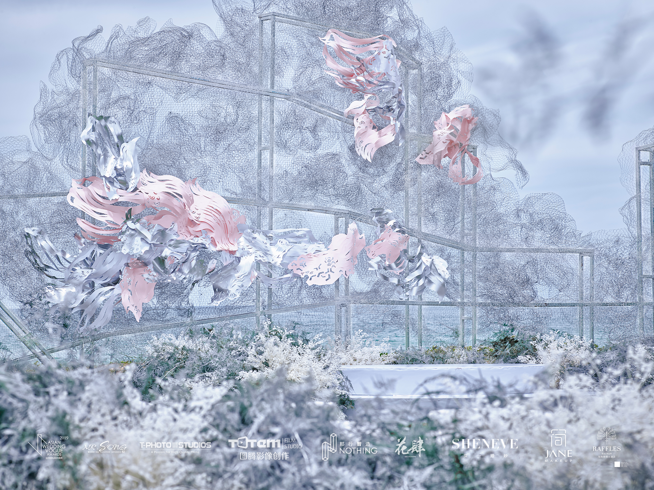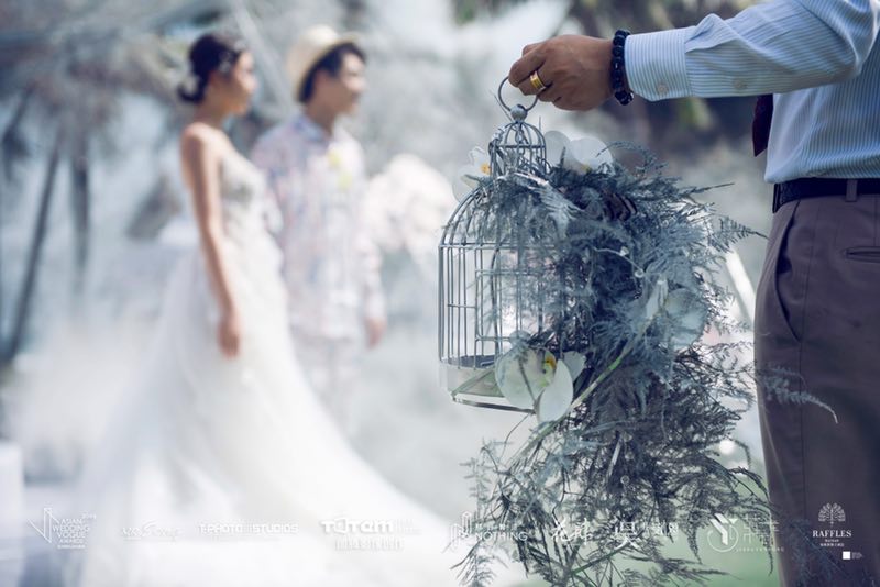 以大海为背景的中舞台设计如同漂浮在海上的云朵,灵动且漂移。搭配飞鸟形状的纸艺,别具东南亚民族风情。