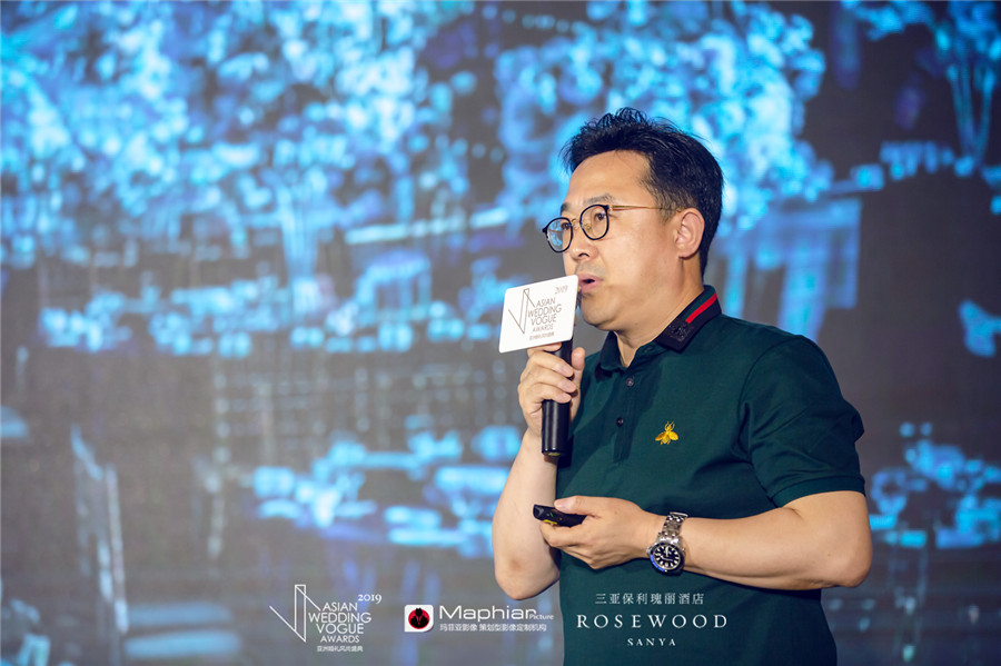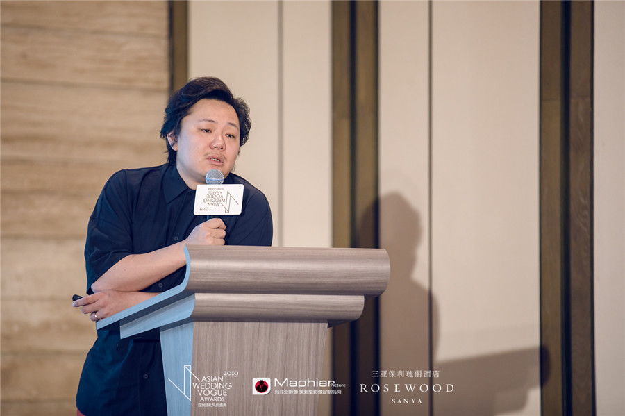 作为“2019亚洲婚礼风尚盛典”参与宴会设计发布的设计师之一,刘斌以其与不羁外在相悖的敏感,对细节和情感有敏锐的把持。他带来的案例分享中,无论是小清新的校园风,亦或耗资不菲的大阵容,都有自成一格的对设计和艺术的掌控与表达。