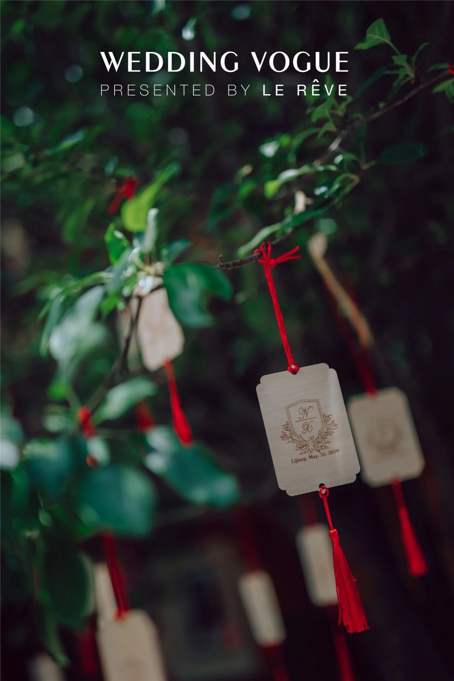 仪式前,所有来宾将写上祝福的特制“祈愿牌“挂在仪式区旁的树上,不仅为婚礼注入云南地域性的人文特色,“祈愿牌”本身的意蕴,也使新人入场就能感受到满满的祝福。
