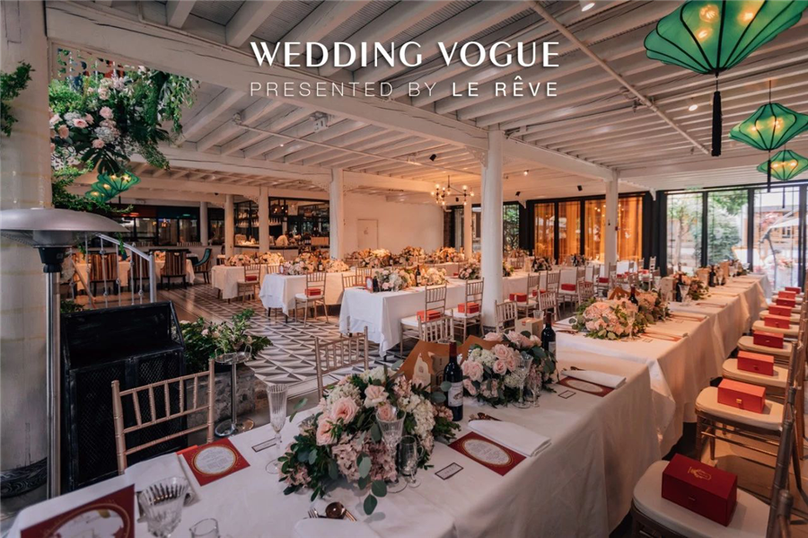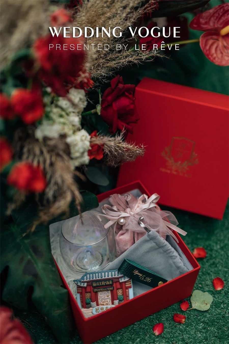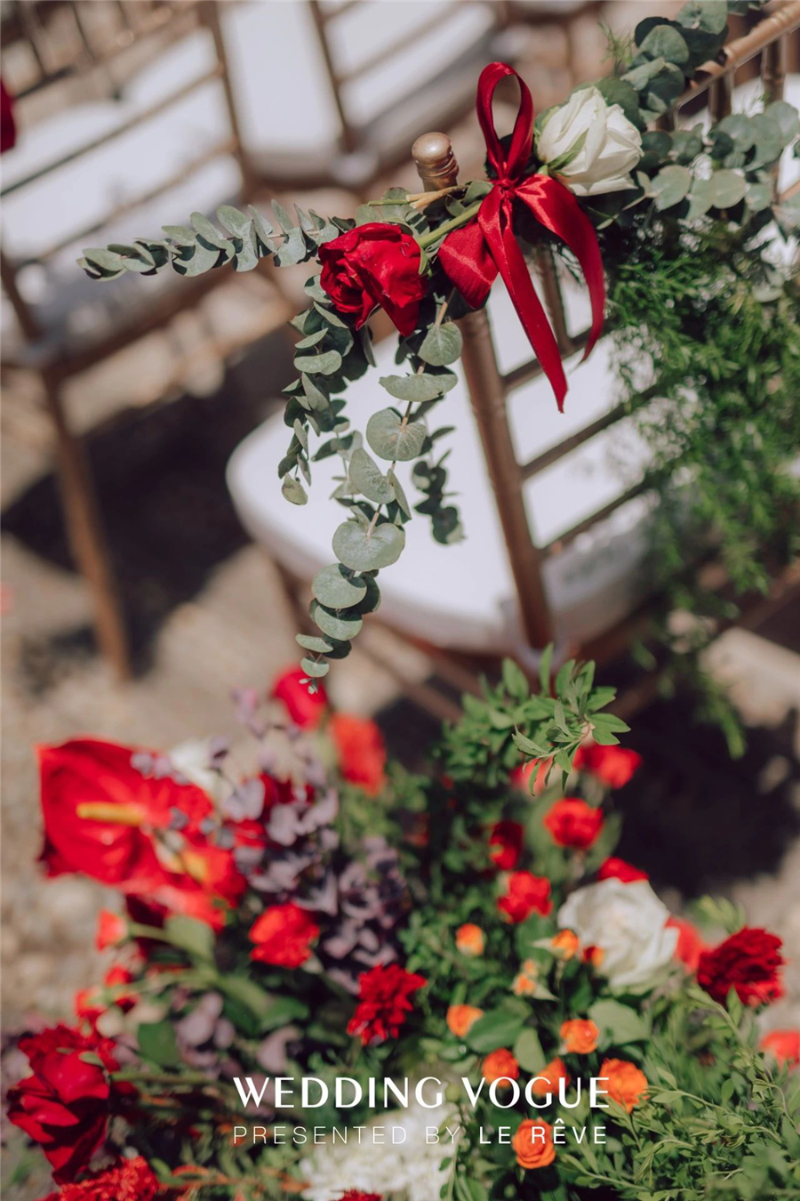 依据酒店庭院和周围中式古建筑风格,加之新人期望的中西结合的感觉,在颜色上,选择了红色和金色,以及呼应场地本身的木质材料,并以大量鲜花细腻细节。