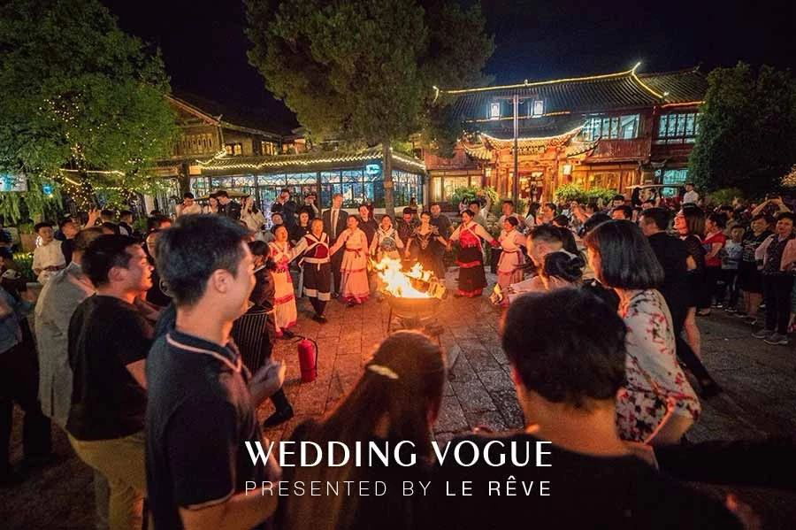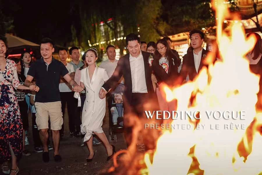 新人、来宾,甚至路人都一起来凑成圆圈,围着篝火,以”丽江的方式“进行这场“丽江的婚礼”。