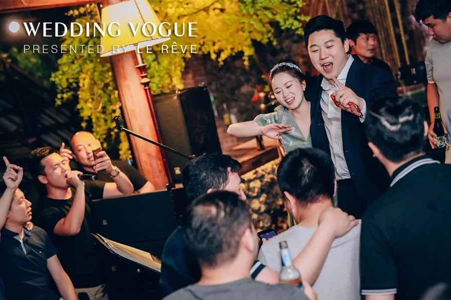 经过打跳舞的热身之后,新人和好友们来到了派对现场,很显然大家很快就进入状态,开启了“麦霸模式”。